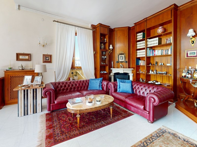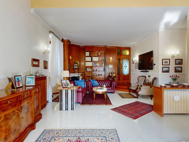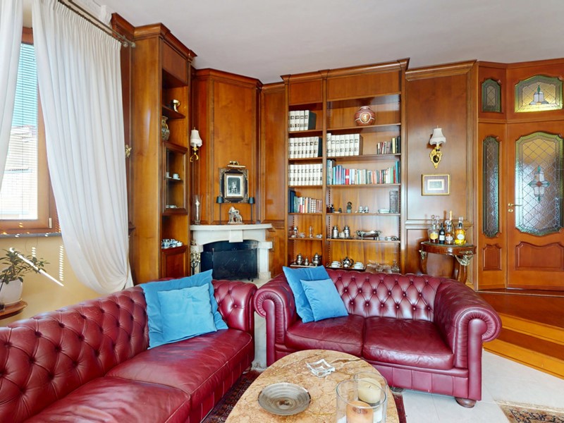 La zona giorno comprende un soggiorno di rappresentanza con libreria su misura e camino e una cucina tinello moderna e ben organizzata.
