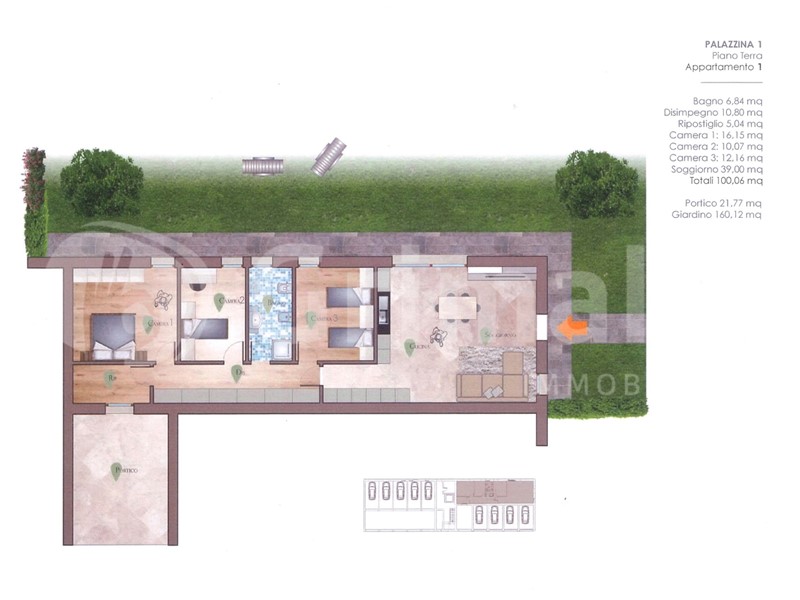 Nello specifico, l'APPARTAMENTO al PIANO TERRA con ingresso autonomo e giardino su due lati di 100 mq, è sviluppato da un ampio e luminoso soggiorno con cucina a vista di 39 mq, tre camere da letto a scalare (matrimoniale di 16 mq, doppia di 12 mq e singola di 10 mq) e doppi servizi finestrati.