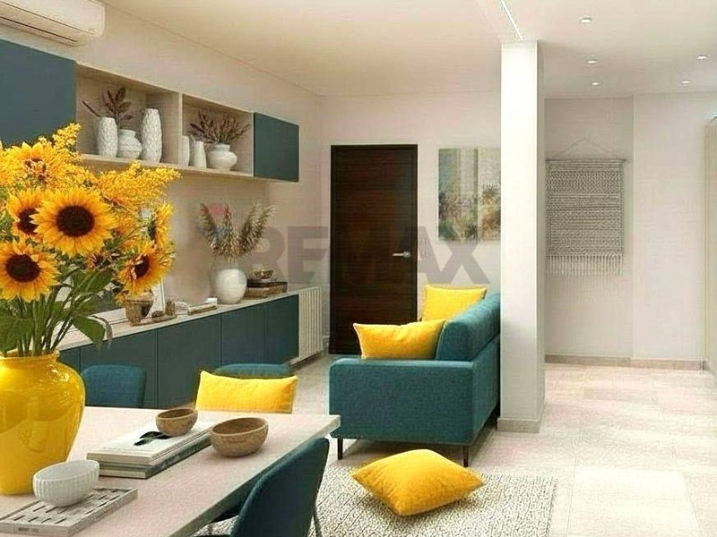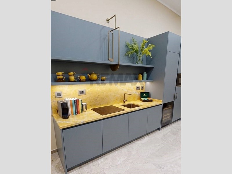 L'interno accoglie con una zona living raffinata e luminosa, caratterizzata dal pregiato gres porcellanato Lapis Sand e da un sofisticato gioco di controsoffitti con faretti LED integrati. La distribuzione degli spazi è fluida e razionale: la zona giorno dialoga con una cucina abitabile funzionale, mentre la zona notte garantisce la massima privacy con una spaziosa camera padronale e una seconda stanza versatile, ideale come studio o dressing room.