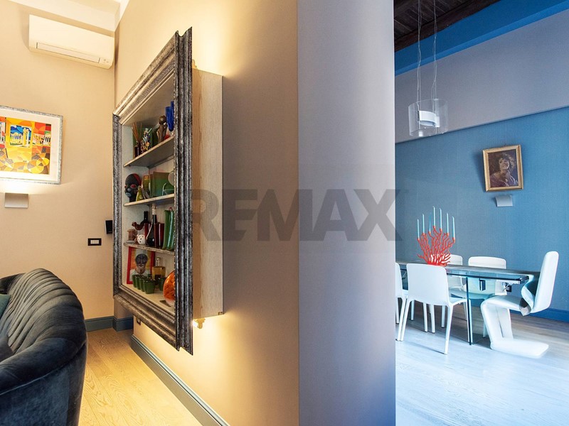 Lappartamento, pur conservando limpianto storico di base, è stato reinventato in chiave moderna, creando un percorso fluido, del tutto privo di porte ad eccezione di quelle degli ambienti di servizio protetti da battenti in vetro fumé, con ambienti che si susseguono a partire dallingresso in un ampio salone di rappresentanza, caratterizzato da due spazi che si fondono armonicamente fra di loro, pur distinti fra la zona salotto e quella pranzo per ospiti di riguardo.