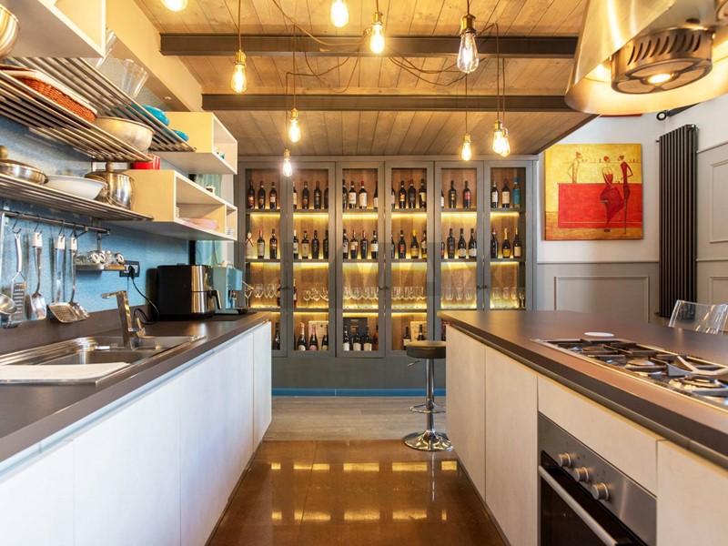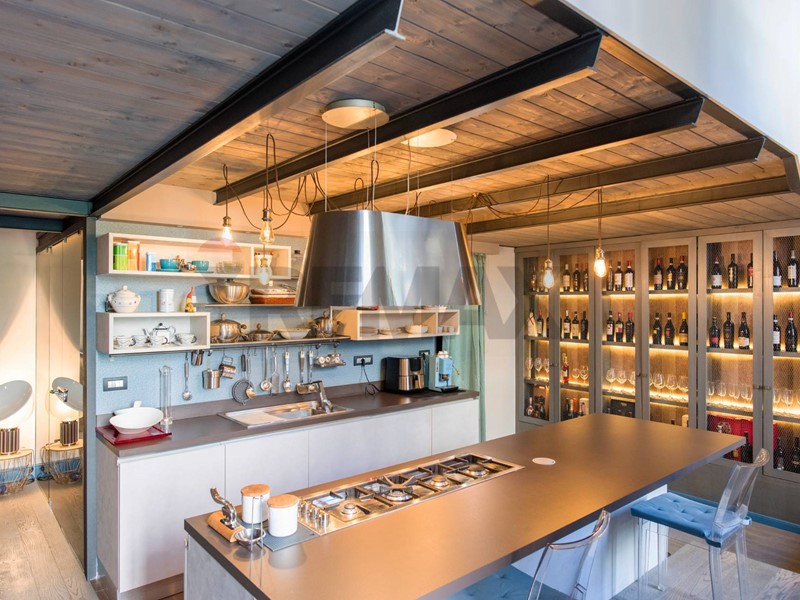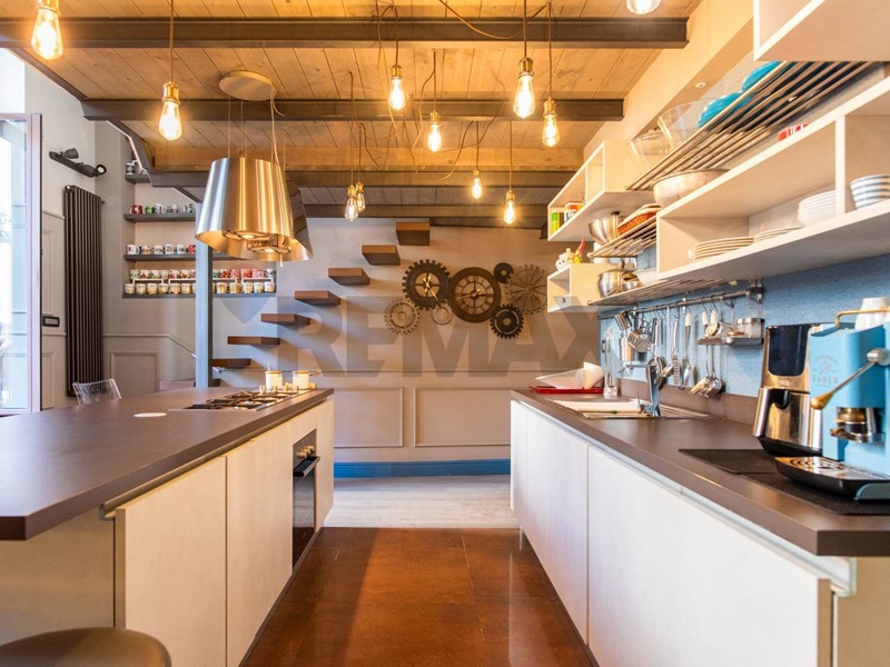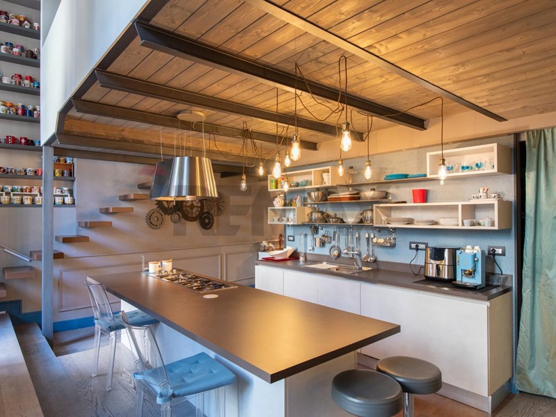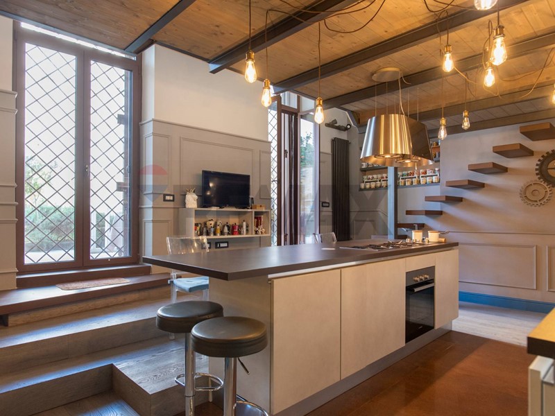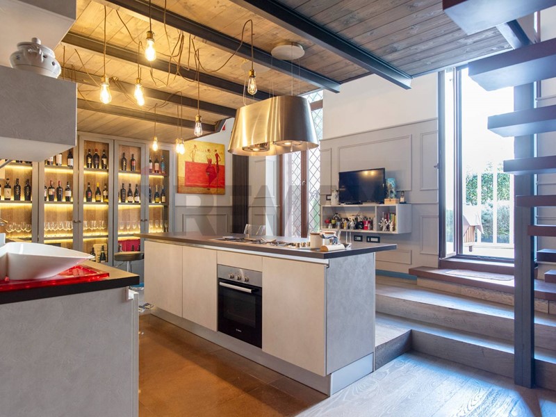 Attraversando un grande studio si accede alla comoda e spaziosa cucina, che affaccia direttamente sul terrazzo, in parte pavimentato, senza nulla togliere al grande giardino pensile che completa la proprietà.