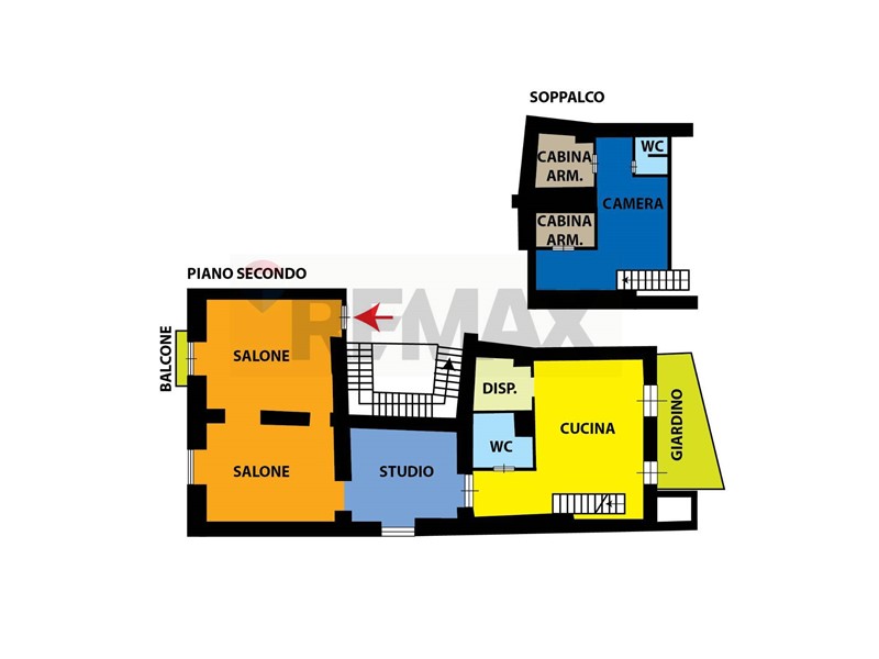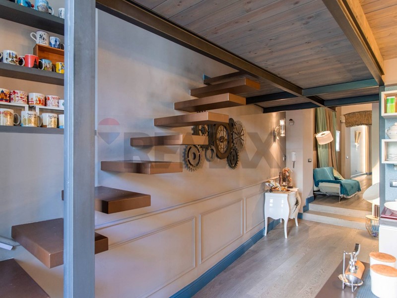 Da questultima, tramite una scala a gradini sospesi, si accede al soppalco che ospita la zona notte, costituita da ununica grande camera da letto, due cabine armadio ed un secondo servizio, il tutto con affaccio a balconata sul livello sottostante, pur conservando la necessaria intimità offerta dal livello soprastante.
