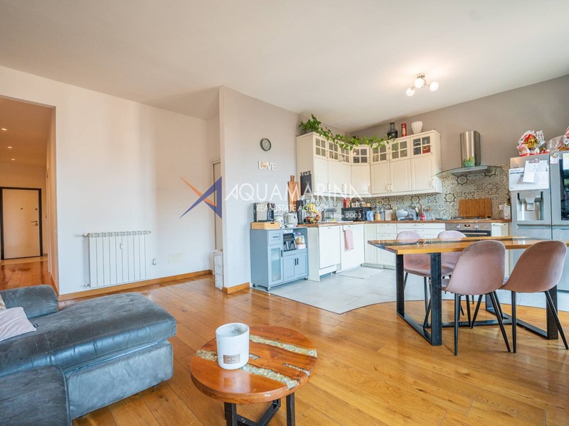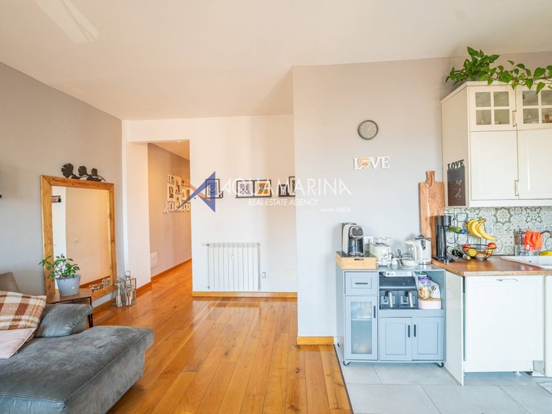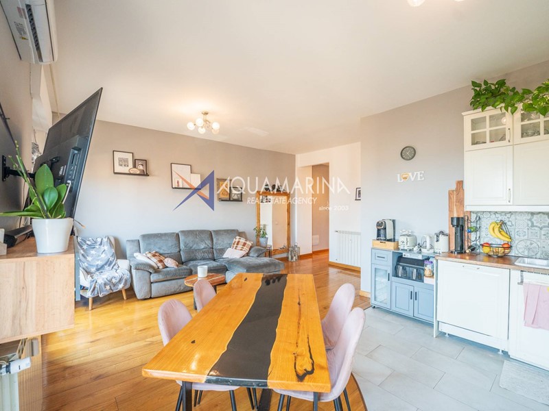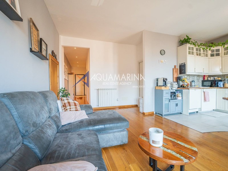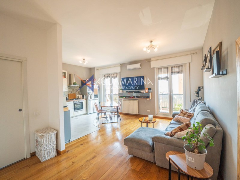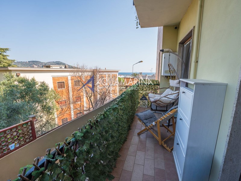 Lappartamento si apre su un ingresso che conduce alla zona giorno, composta da un luminoso soggiorno con cucina a vista, uno spazio accogliente e ben organizzato. Da qui si accede a un ampio balcone con piacevole vista mare, ideale per momenti di relax.