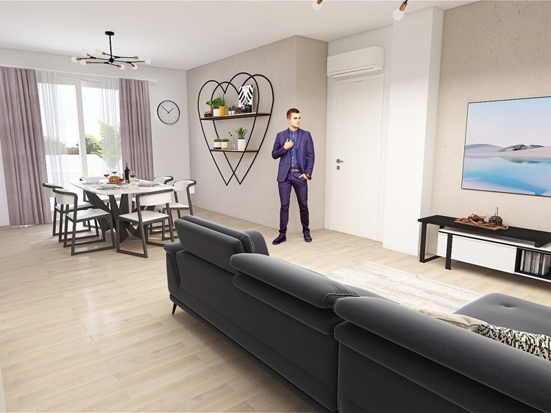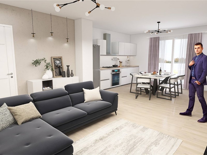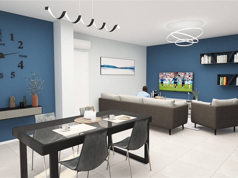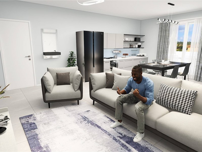 Si compone da Ingresso in Soggiorno con Cucina living e affaccio sul Terrazzo, disimpegno notte, 2 Camere da Letto e 2 Bagni.