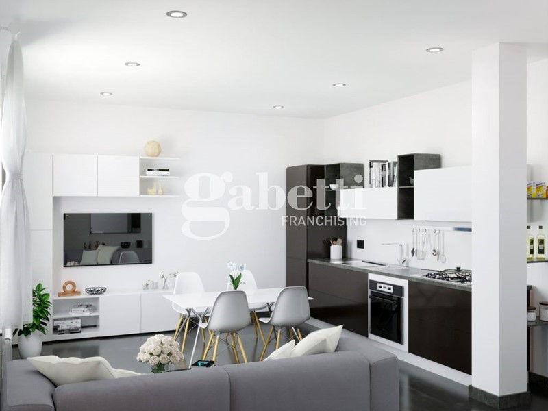 Ingresso su zona living con angolo cottura, disimpegno, ampia camera matrimoniale e servizio igienico non finestrato.