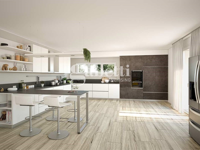 Pavimenti in parquet e rivestimenti in gress porcellanato.