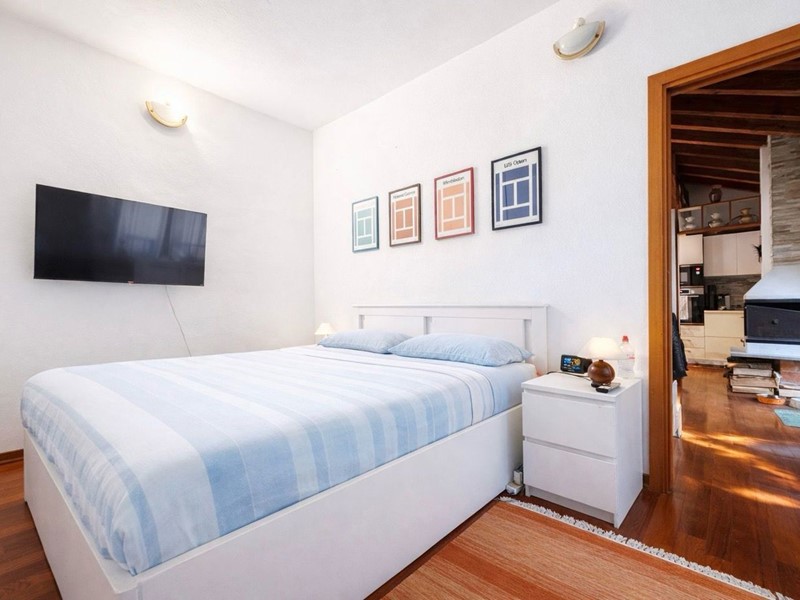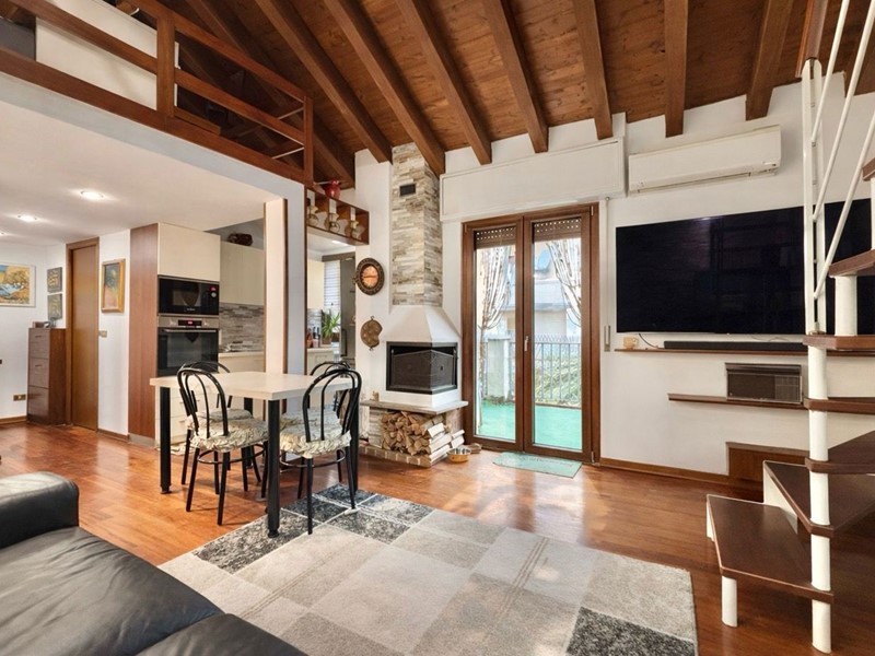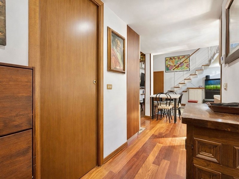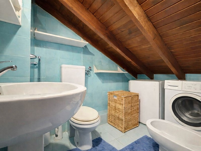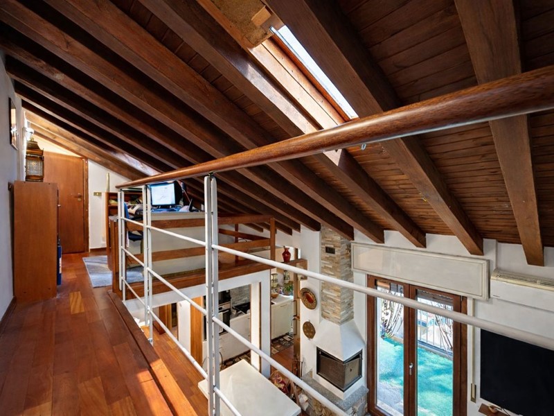 La pavimentazione in parquet, omogenea in tutto l'appartamento ad eccezione dei bagni, conferisce un tocco di eleganza all'ambiente, mentre le travi a vista aggiungono un fascino architettonico unico e ricercato.