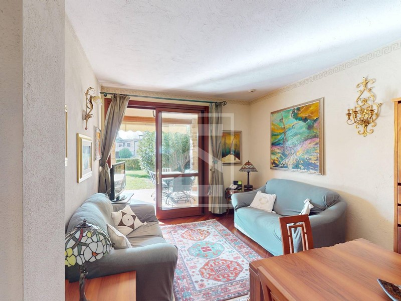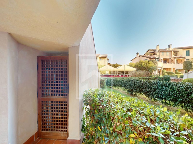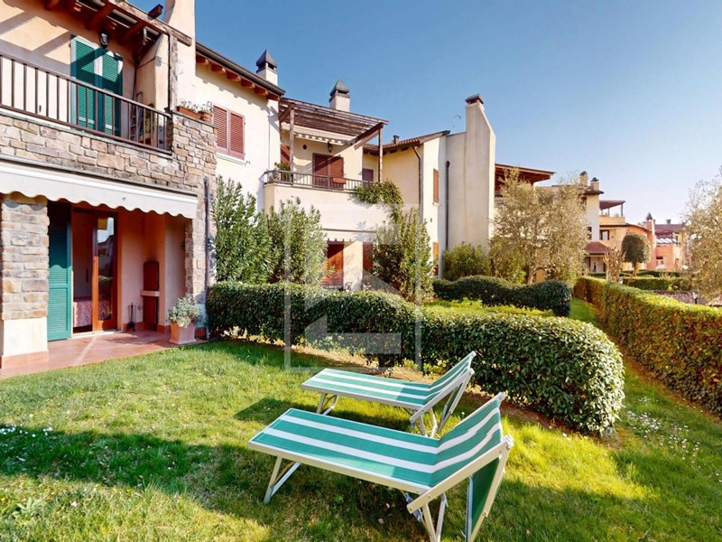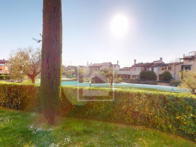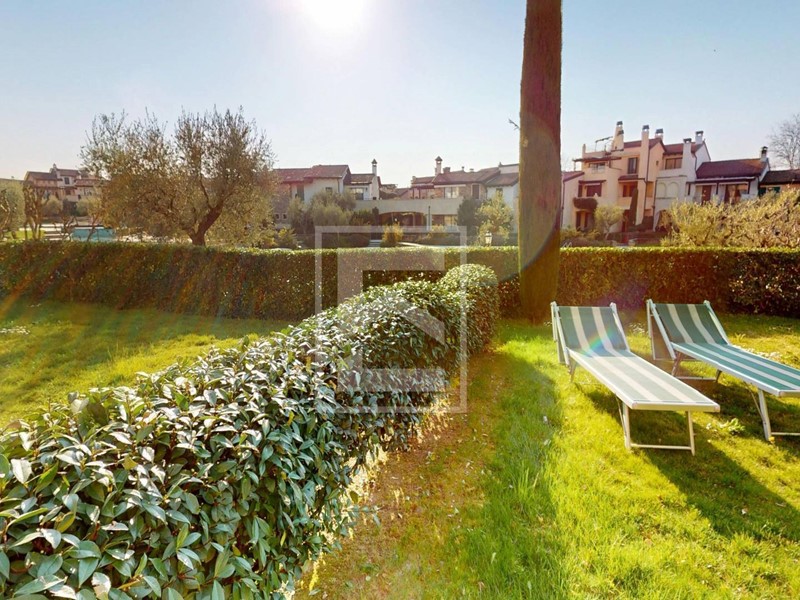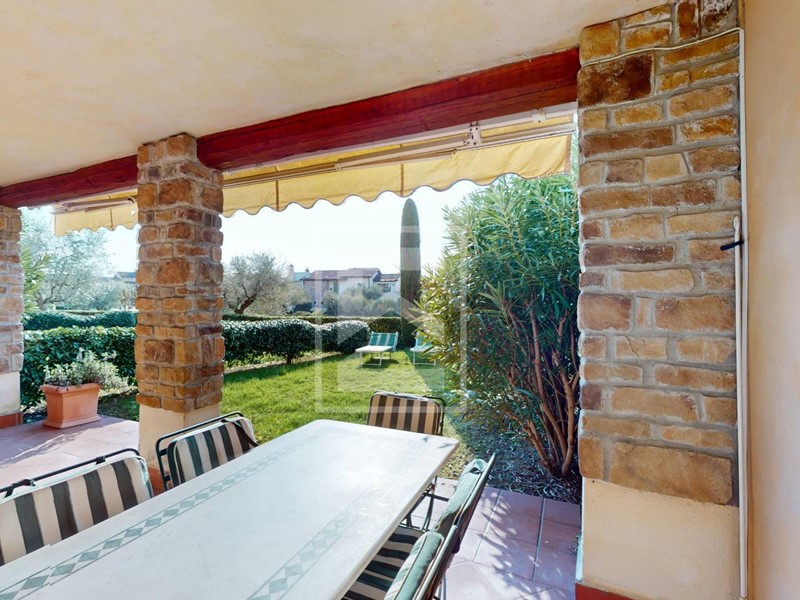 Trilocale piano terra con ampio portico e doppi giardini al Garda Resort Village, uno splendido residence con un enorme parco, piscine, ristorante e una vasta gamma di strutture sportive e ricreative.