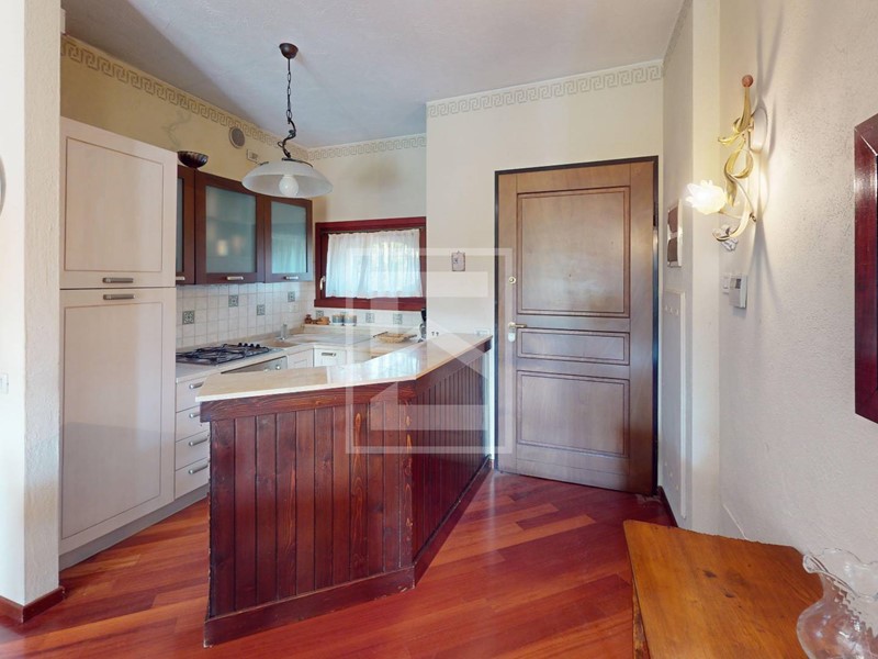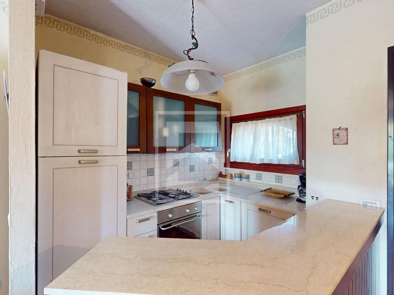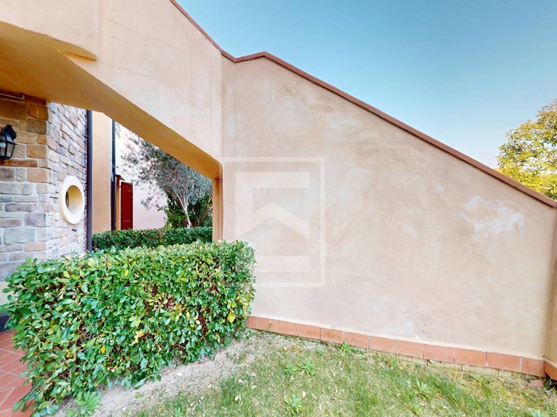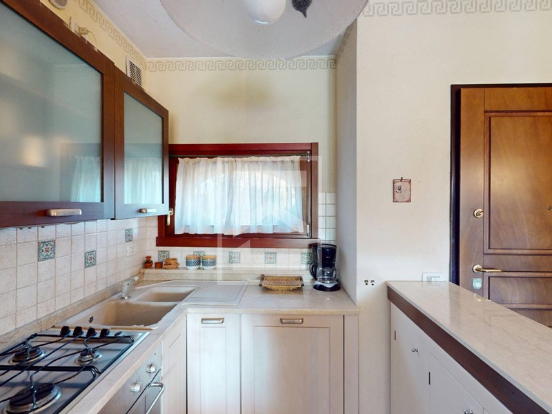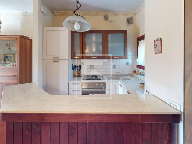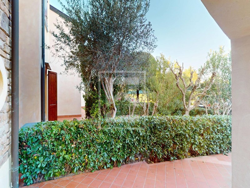 L'appartamento al piano terra viene venduto arredato, con mobilio buona qualità. La zona giorno è molto ampia e luminosa con disimpegno d'entrata, angola cottura studiato a misura e grande portafinestra per accedere al portico e giardino privato con vista su una delle piscine del residence. L'appartamento è un piano terra rialzato senza dislivelli o scale d'entrata, il che lo rende pratico e molto riservato, essendo rialzato anche la vista esterna e della piscina rimane quindi più dominante rispetto al generico piano terra.
