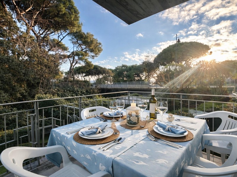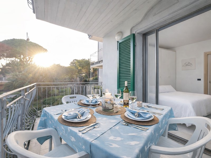 Il vero punto di forza della proprietà è lo spazio esterno: una terrazza abitabile, ideale per pranzi e momenti di relax, collegata tramite una comoda scaletta a un giardino privato, una soluzione rara così vicina al mare.