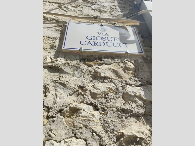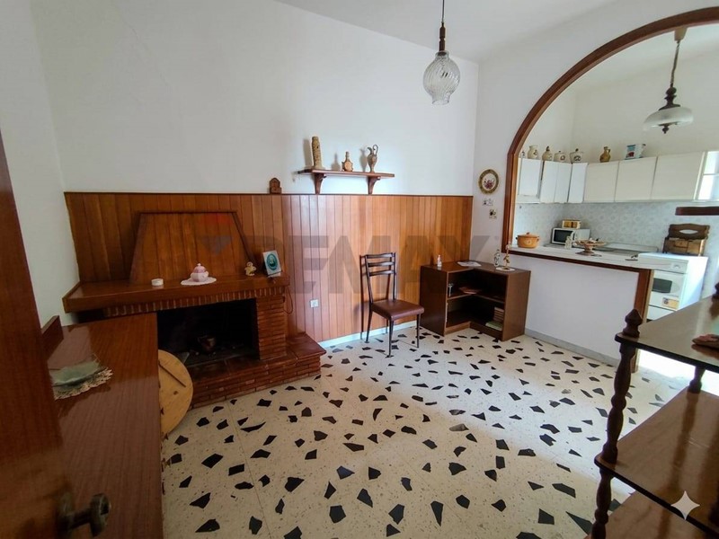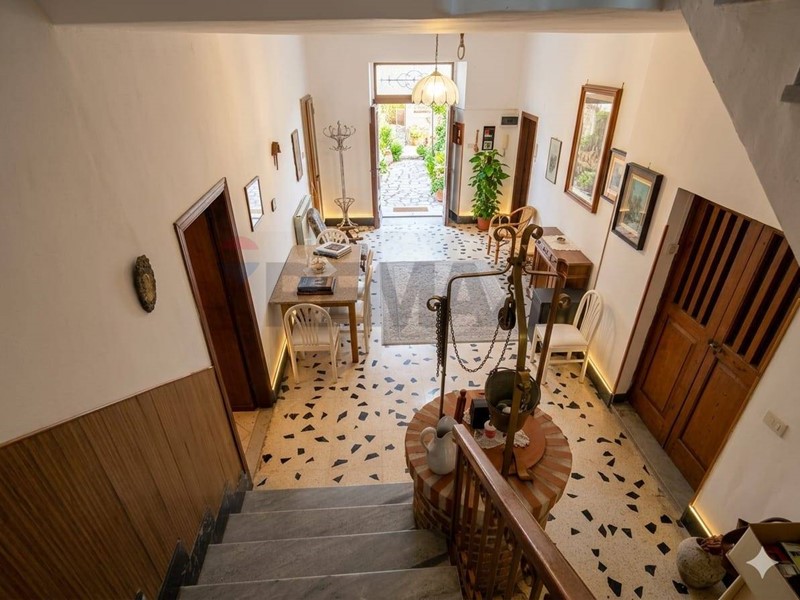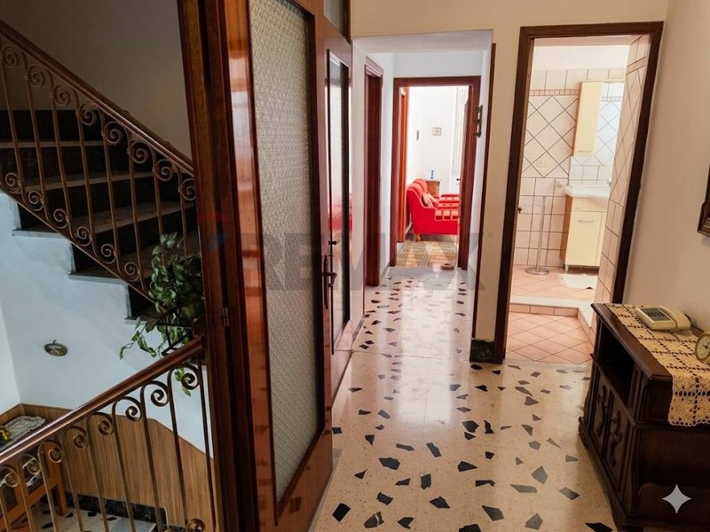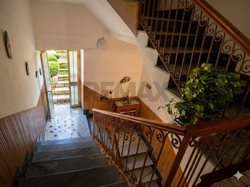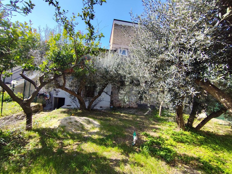 Salendo al primo piano si esce fuori nel giardino di ca. 200 mq con alberi di ulivo e cancello carrabile per accedere con la macchina. Salendo un'altra rampa di scale troviamo 3 camere da letto, un bagno con doccia, e un open-space dove c'è un'altra cucina che verrà rimossa, un salottino con uscita sul terrazzo con vista mare.