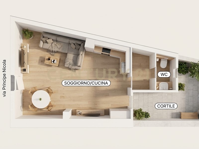Ingresso su ampio doppio vano soppalcato, doppio servizio e cortile di proprietà esclusiva