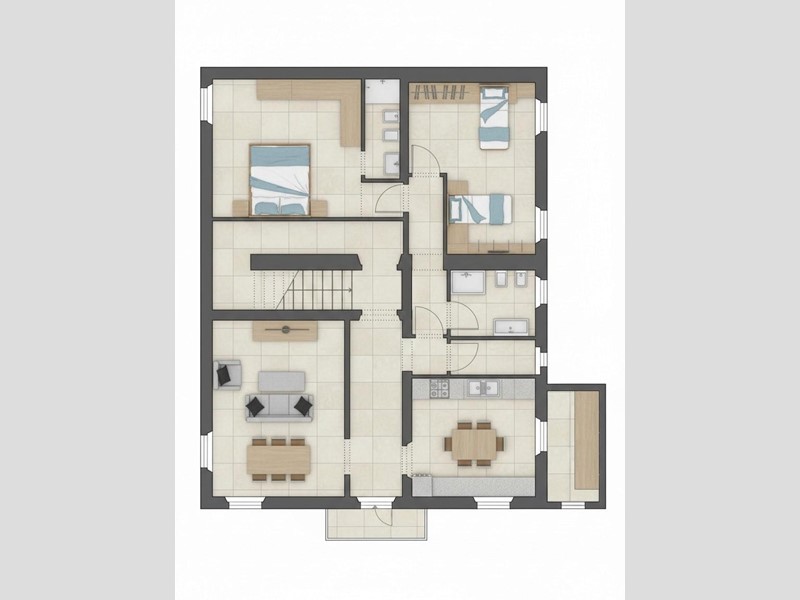 L’immobile, situato al primo piano di un condominio, si sviluppa su una superficie di circa 113 mq per un totale di 7 vani ed è stato progettato per offrire ambienti funzionali, ben distribuiti e facilmente adattabili alle diverse esigenze abitative. Dall'ingresso si giunge, attraverso un corridoio, alla luminosa zona giorno e, adiacente, al reparto cucina: spazi luminosi, accoglienti e spaziosi. La zona notte prevede due camere da letto, con la concreta possibilità di ricavarne una terza sfruttando l’attuale configurazione della seconda camera. È presente un bagno principale ed è già prevista la predisposizione per la realizzazione di un secondo bagno in camera, con un costo aggiuntivo a carico dell’acquirente pari a circa €6.000.
