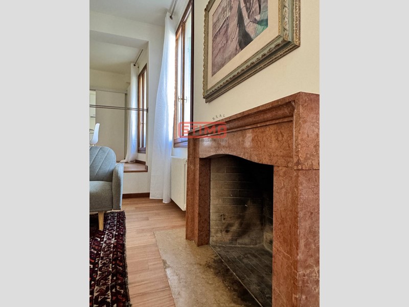 Soggiorno con zona cucina accogliente, impreziosito da caminetto ornamentale, elemento di charme e atmosfera (non utilizzabile, come da normativa del centro storico)