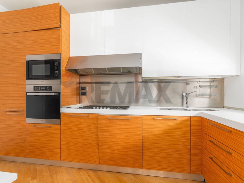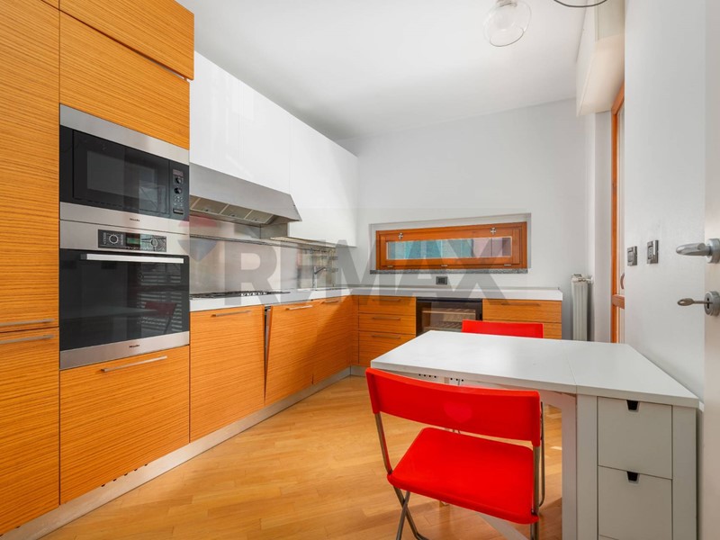 La cucina è corredata di lavastoviglie, forno ad incasso, forno a microonde ad incasso, frigo-cantina per vini ad incasso. Lavatrice inclusa.