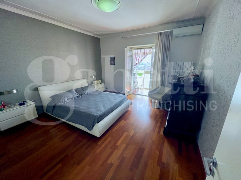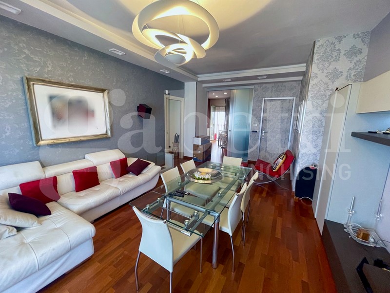 La doppia esposizione panoramica regala scorci unici sul mare e sull'Etna. Le finiture includono parquet in legno pregiato, porte interne laccate bianche, controsoffitti in cartongesso con faretti e strip LED.
