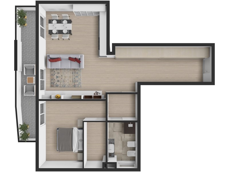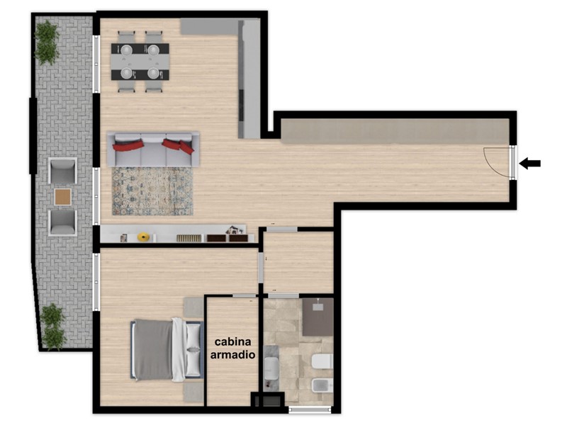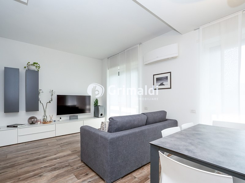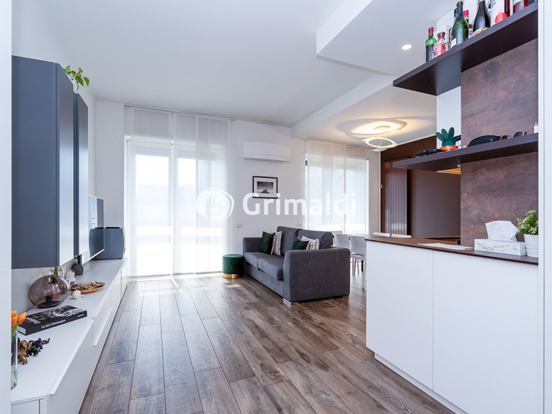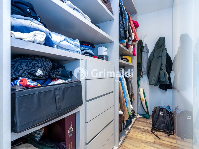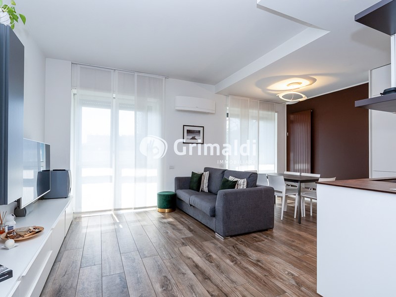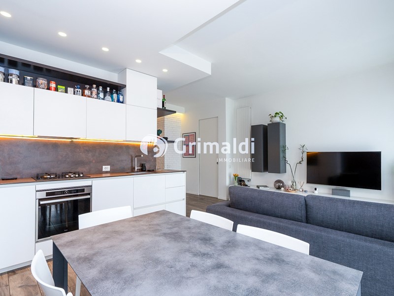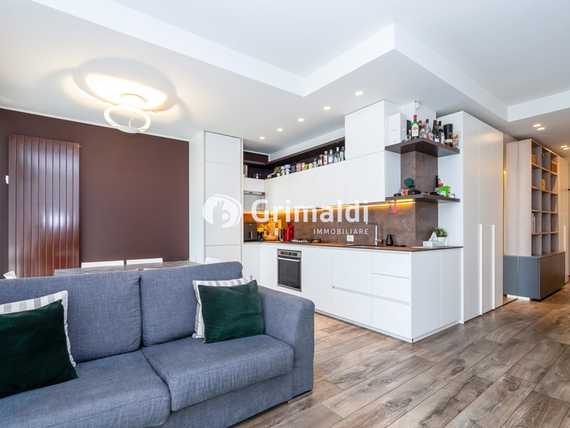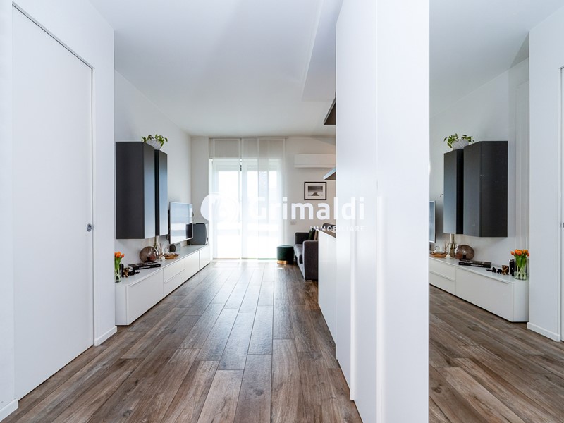 L'abitazione si compone di ampio ingresso completo di armadiatura a muro ad uso scarpiera/cappottiera, luminoso soggiorno con cucina a vista, comodo balcone, camera matrimoniale con elegante cabina armadio in vetro, bagno finestrato e cantina al piano seminterrato.