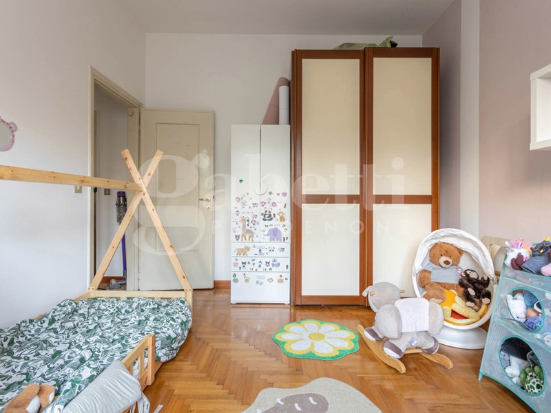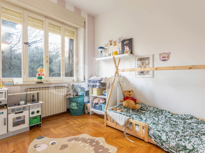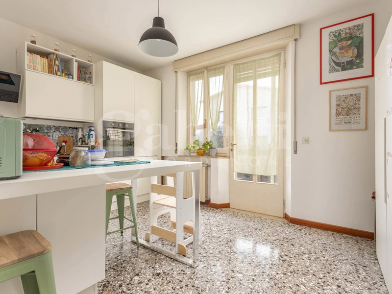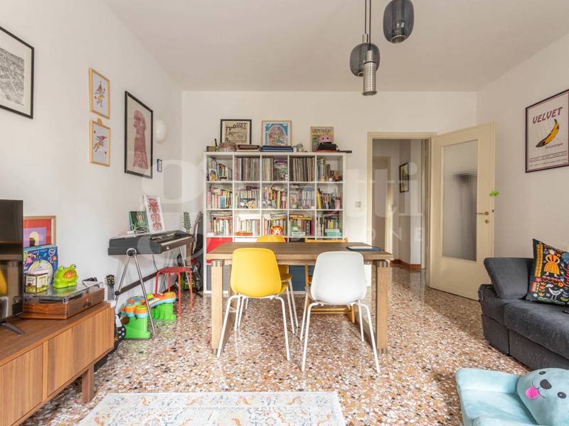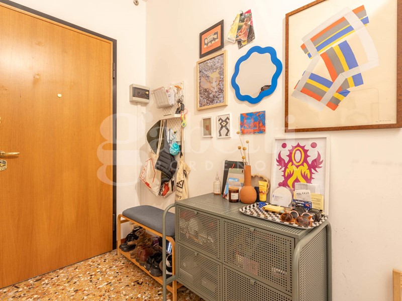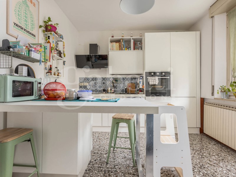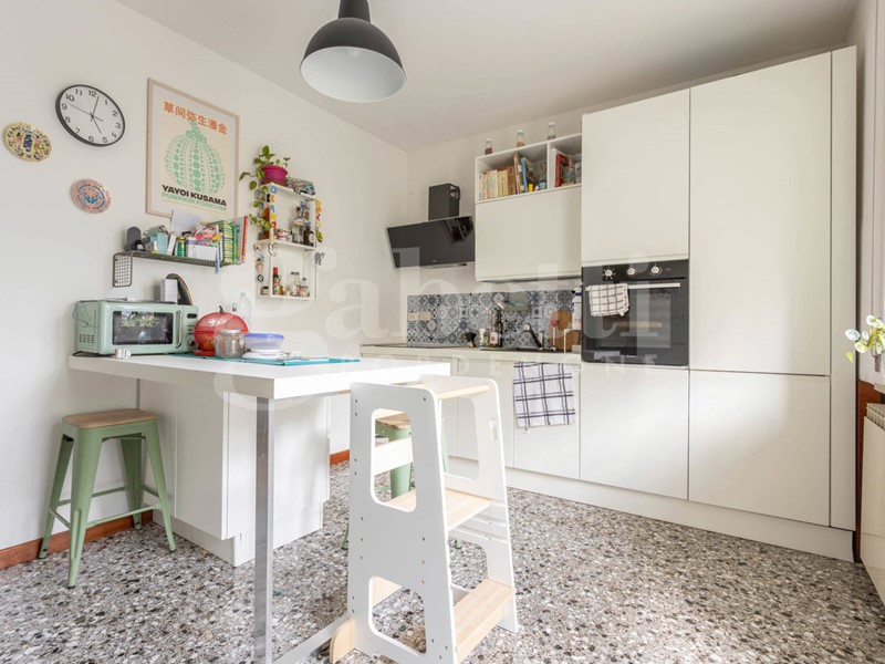 L'ingresso generoso accoglie in un ambiente caratterizzato dal seminato veneziano su tutta la zona giorno. L'ampio generoso soggiorno dal doppio volume ospita comodamente zona relax e zona pranzo. La cucina separata è abitabile e apre al comodo poggiolo. Un disbrigo tecnico è comodo sfogo al living quotidiano.