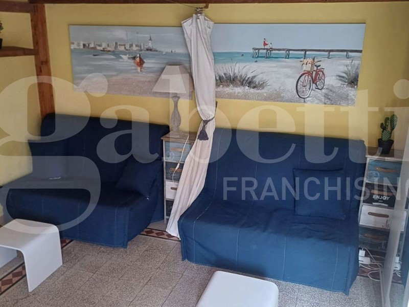 La casa ha ingresso sul cucinino (dotato di piastra mobile ad induzione), camera da letto (con due divani letto e il soppalco dotato di un letto a mezza piazza) con finestra, bagnetto con servizi e doccia e finestrella. Completa la casa il balconcino a livello.