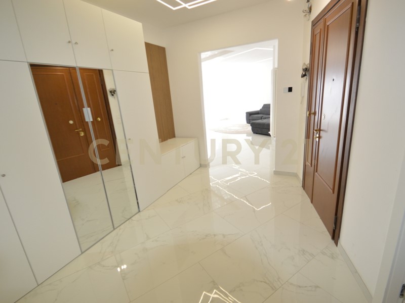 L’ingresso, ampio ed elegante, introduce immediatamente in un’atmosfera di grande respiro, anticipando il carattere distintivo dell’abitazione. Da qui si accede al salone principale, un ambiente luminoso e scenografico, dove le ampie superfici e la luce naturale si fondono con la ricercatezza della ristrutturazione appena ultimata. Le finiture in gres porcellanato effetto marmo, di altissimo livello, donano continuità visiva e un’impronta sofisticata a tutto l'appartamento. Il salone è inoltre arricchito dall’accesso diretto al balcone.
