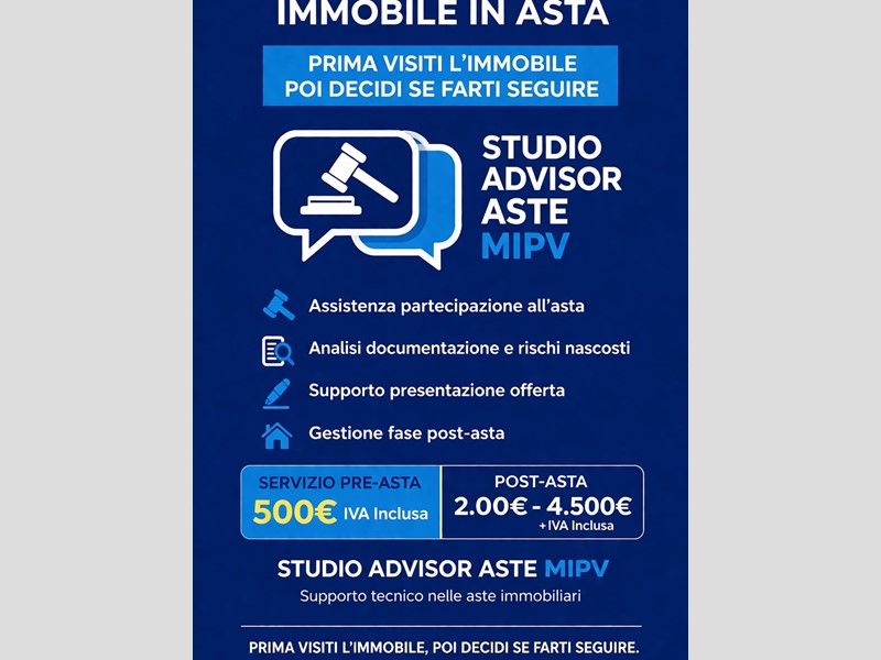 Nota informativa Questo annuncio è stato redatto da Studio Advisor Aste MiPv sulla base della documentazione ufficiale di vendita. Le informazioni qui riportate non sostituiscono la pubblicità legale e potrebbero contenere imprecisioni o variazioni rispetto agli atti ufficiali. Studio Advisor Aste MiPv declina ogni responsabilità per errori, omissioni o modifiche intervenute successivamente alla pubblicazione.