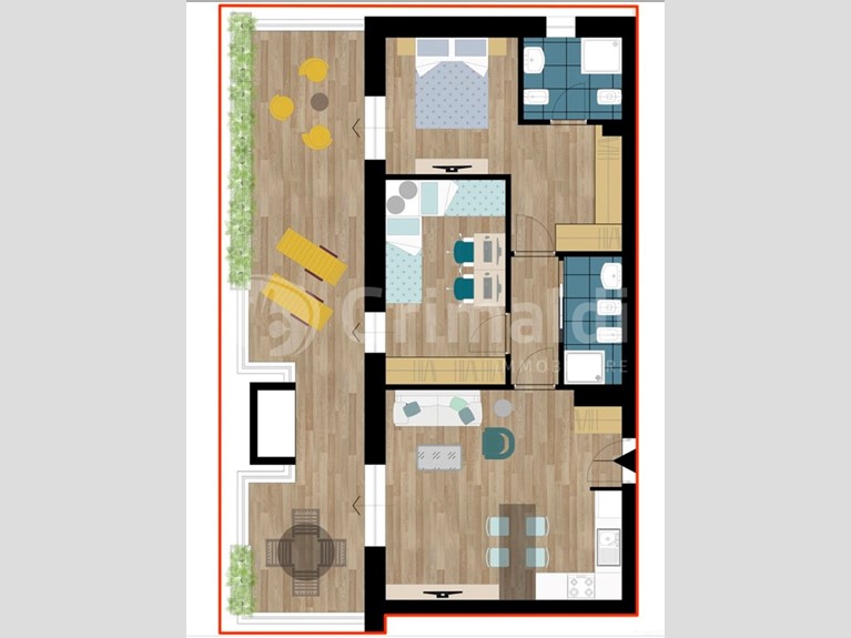 DISPONIAMO DI DIVERSE TIPOLOGIE DI TRILOCALI con TERRAZZO, a partire da Euro 383.000,00, tutti corredati da finiture eleganti ed esclusive, con infissi in legno laccato "Dear", pavimenti e rivestimenti in gres porcellanato "Energie Ker", esterni arricchiti con cristalli e fioriere in cemento bianco, impianti firmati da grandi e storici marchi quali "BTicino" e "Ideal Standard".