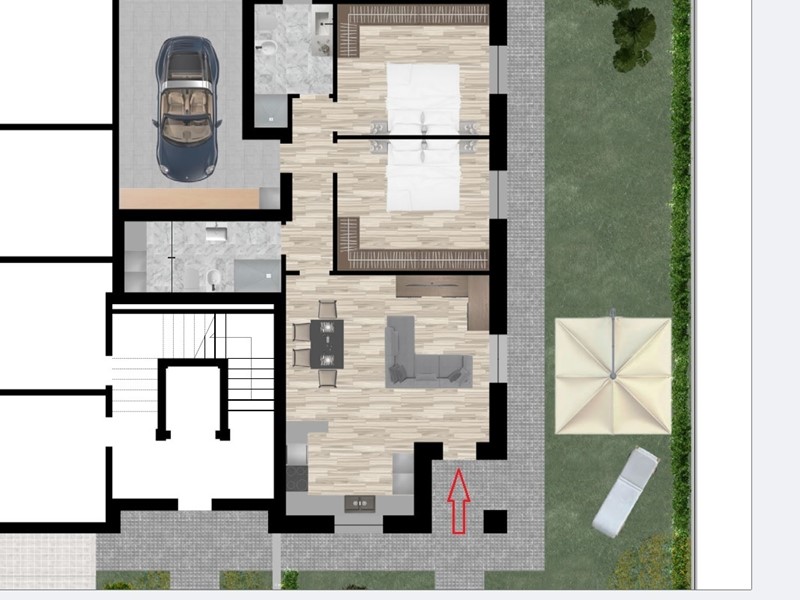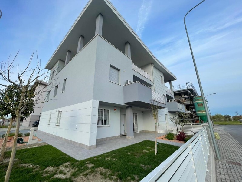 In piccolo contesto appartamento al piano terra con GIARDINO, composto da: ampia zona giorno con cucina a vista con sfogo esterno su giardino, disimpegno, due camere da letto e doppi servizi. Garage al piano terra.