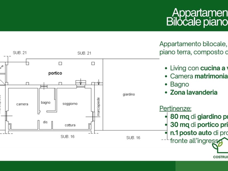 Bilocale con n.1 camera matrimoniale, living con cucina a vista, bagno, locale