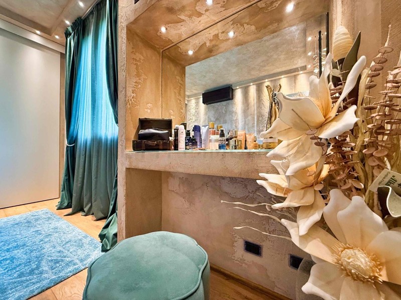 L’illuminazione è uno dei punti di forza: circa 60 faretti incassati e dimmerabili, distribuiti in tutti gli ambienti e nelle nicchie, creano un’atmosfera calda, accogliente e suggestiva.