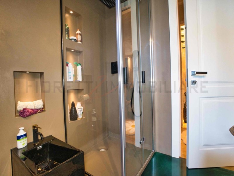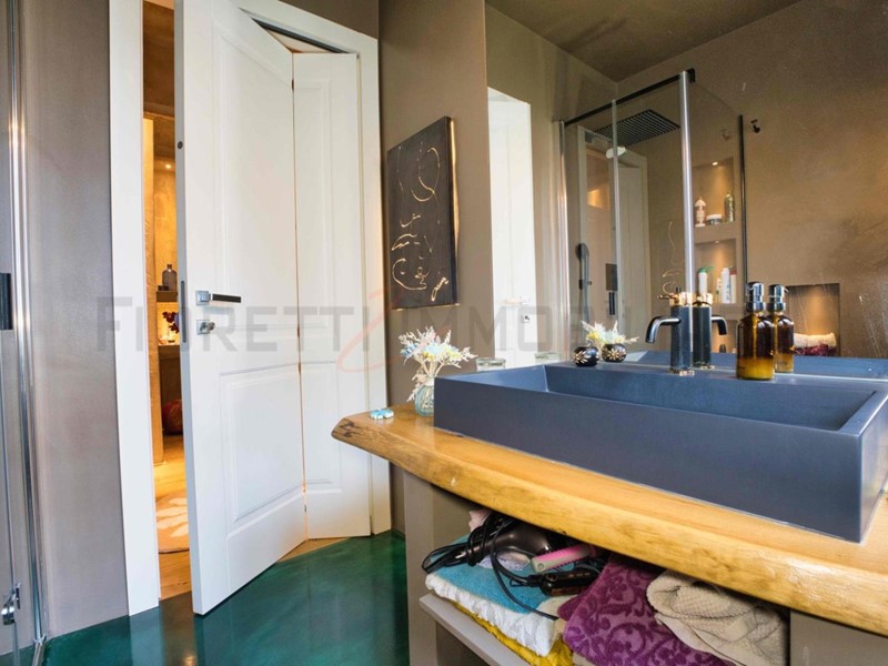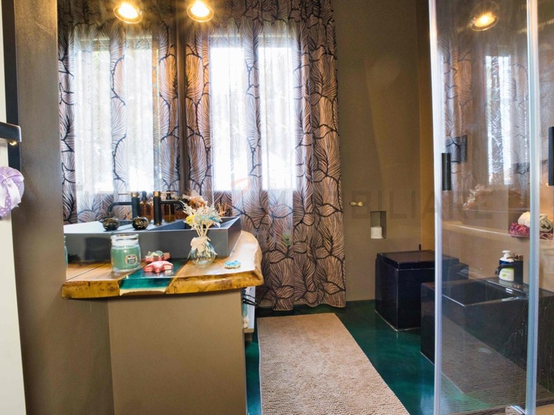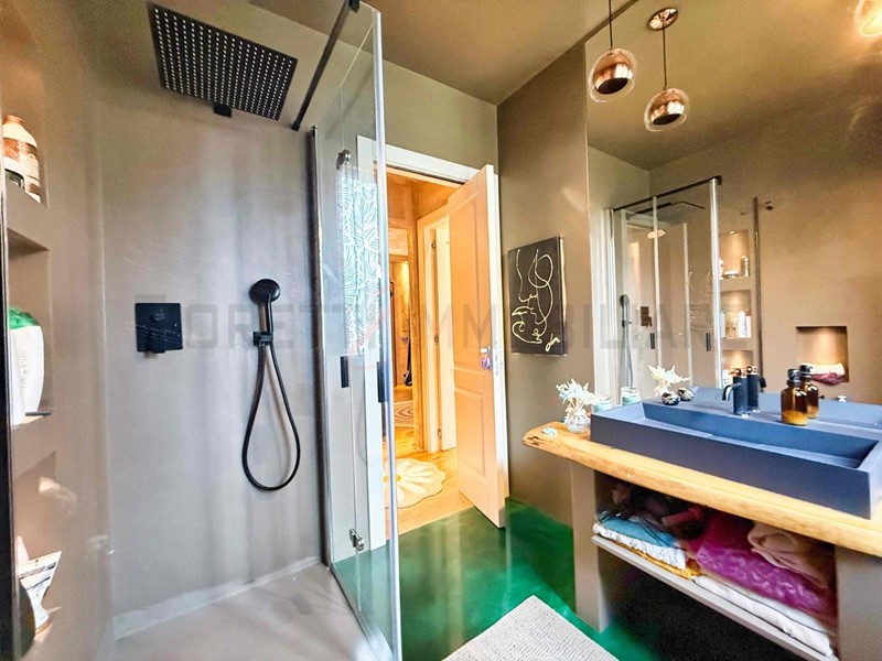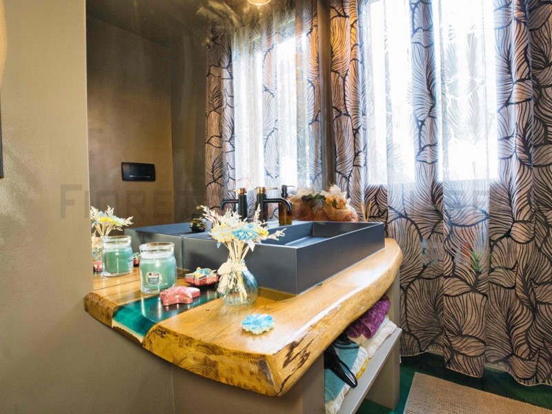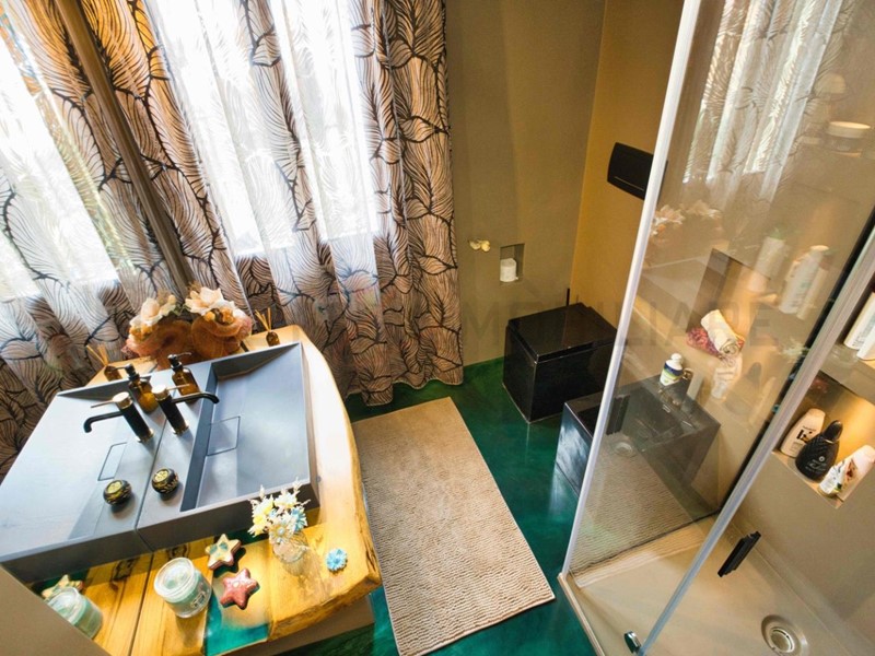 Il bagno, dal design moderno, è realizzato interamente in resina (pavimento, rivestimenti e piano d’appoggio), con sanitari di particolare pregio e unicità.