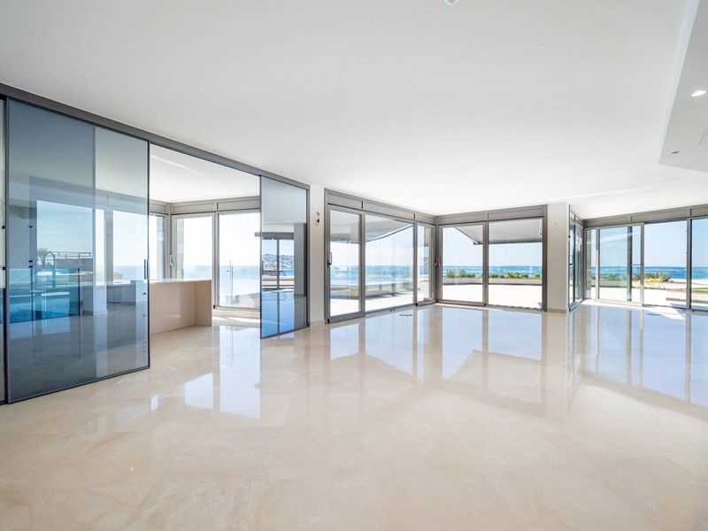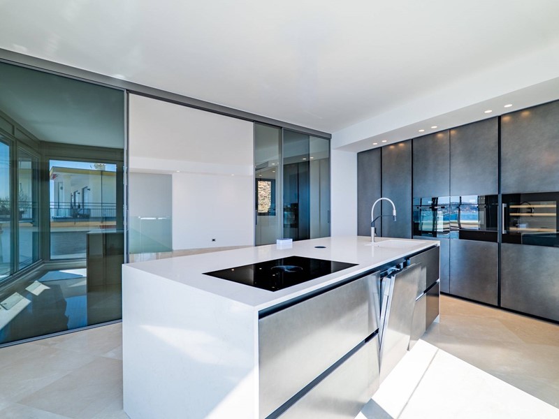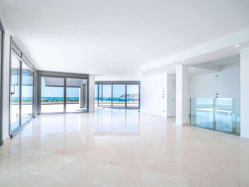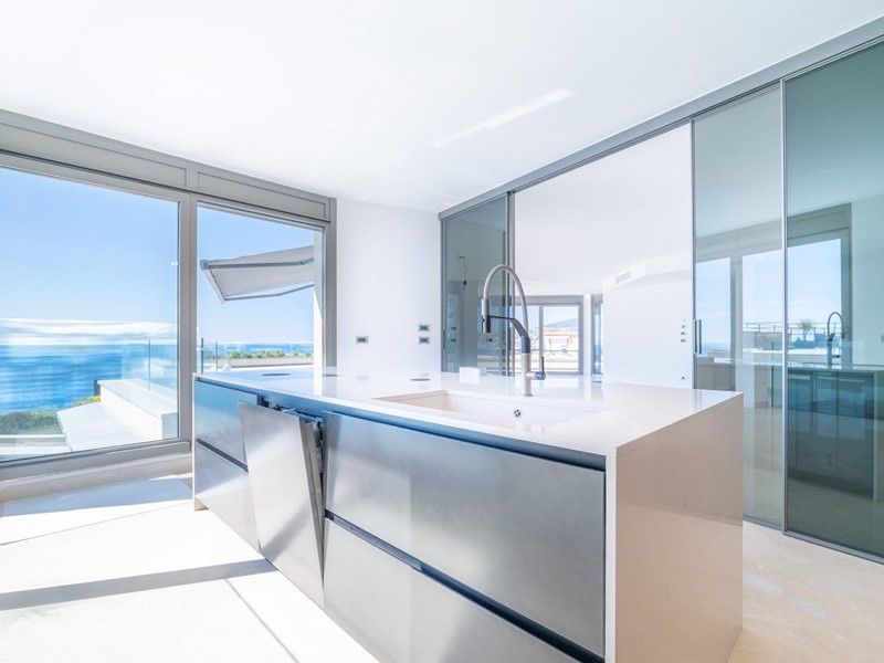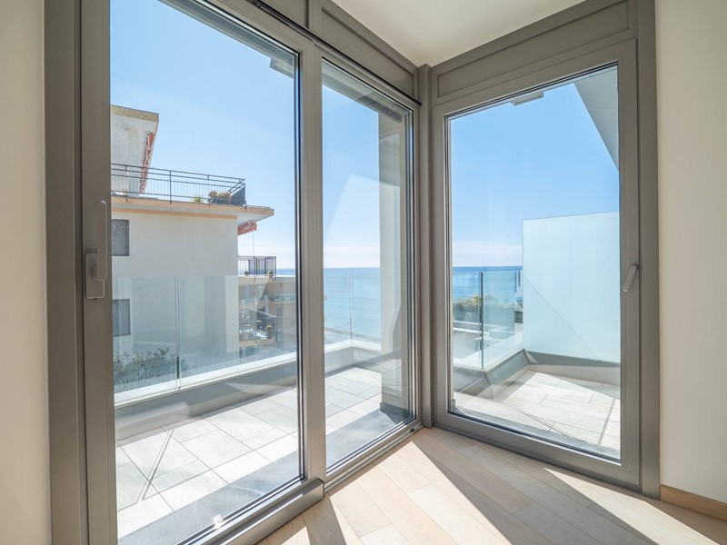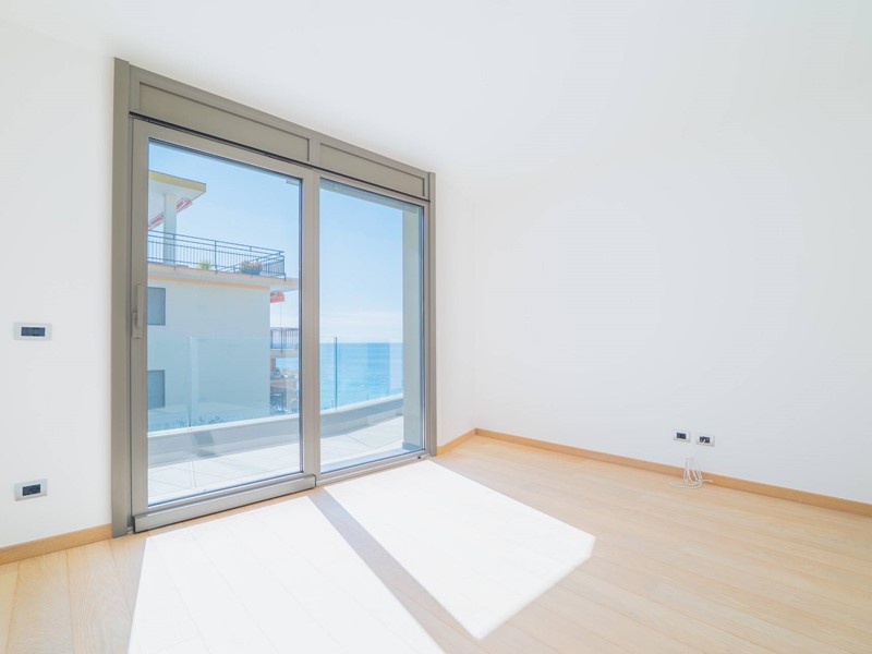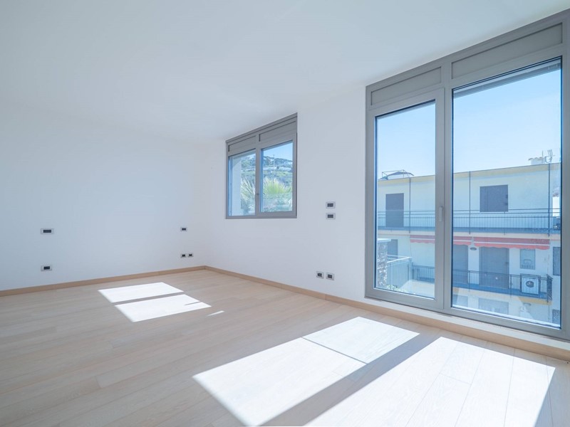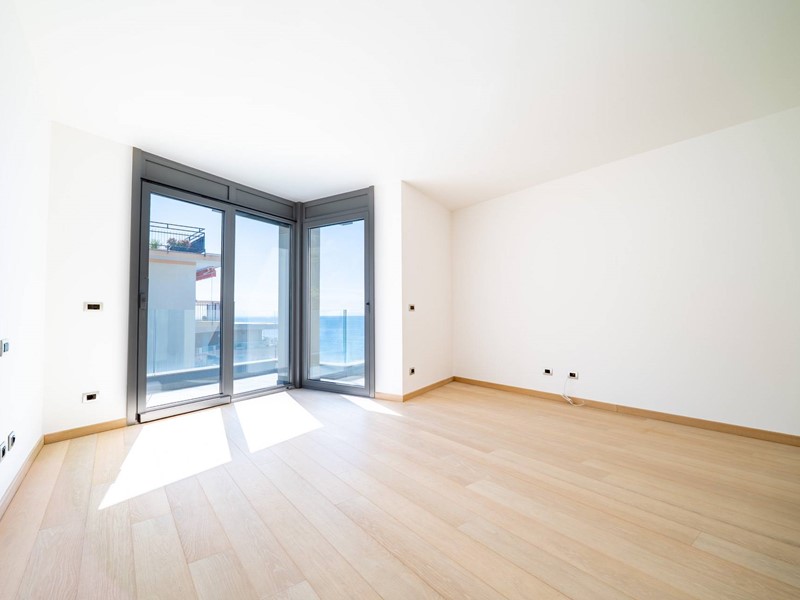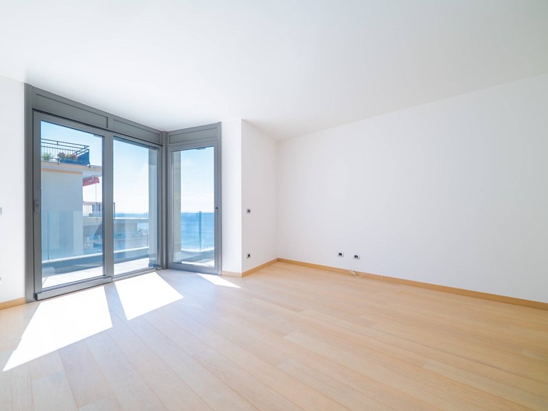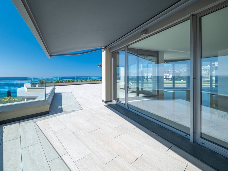 Terzo piano: ampia e luminosa zona living con salone triplo affacciato sui terrazzi vista mare, cucina contemporanea con vetrata a scomparsa, una camera da letto, cabina armadio e bagno.