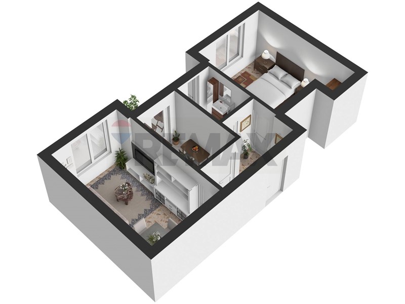 Dispone di due locali, di cui una spaziosa camera da letto e una cucinotto un bagno ed un soggiorno. L'arredamento è semplice ma funzionale, con infissi in legno e vetro singolo.
