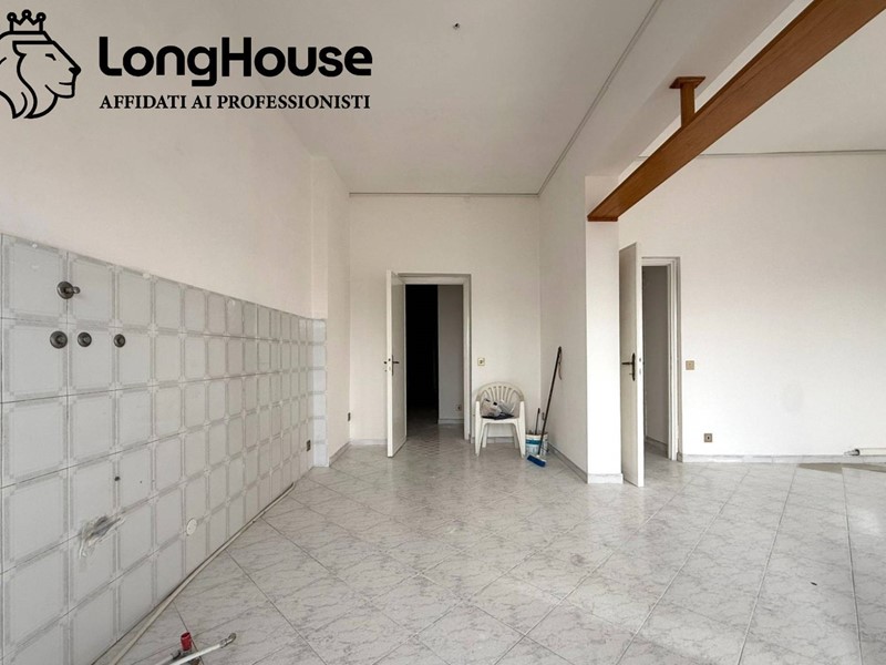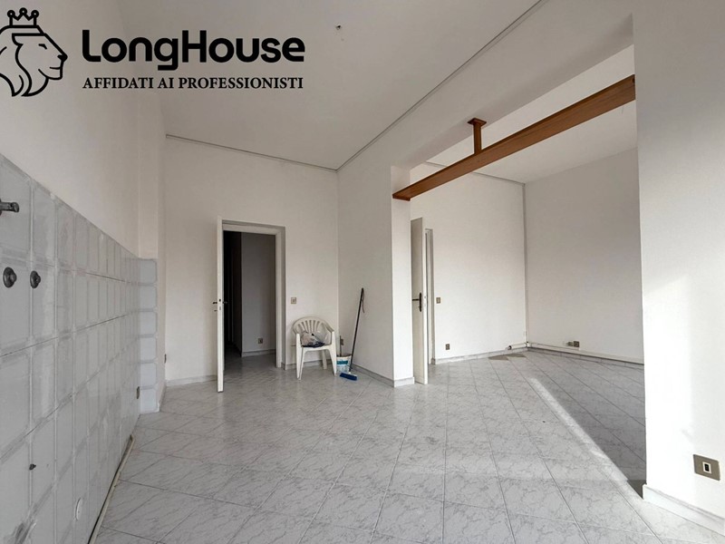 Ingresso, corridoio, ampio salone open space con cucina abitabile, due camere da letto, bagno finestrato con doccia e un balcone.