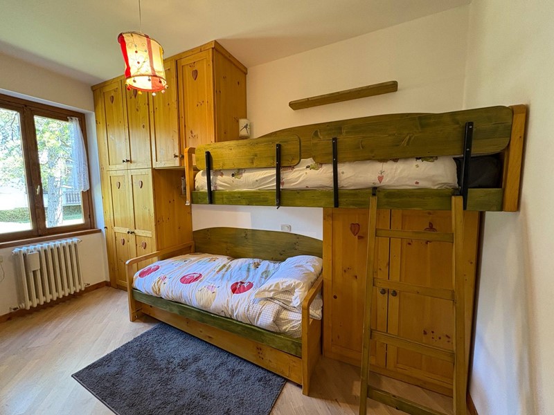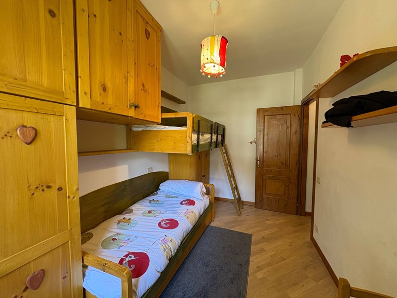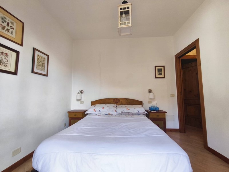 La zona notte, ben distribuita, comprende una camera matrimoniale comunicante con il terrazzo, una seconda camera con vista panoramica sulla montagna e un bagno finestrato.