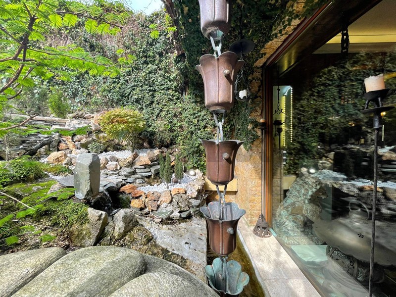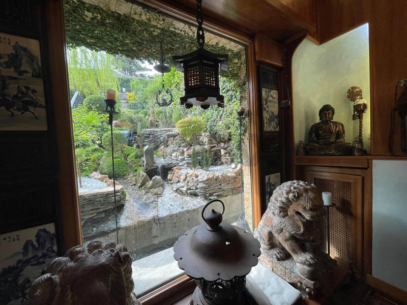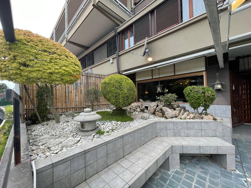 Prestigiosa sala da pranzo con vetrata sul giardino zen e bonsai.