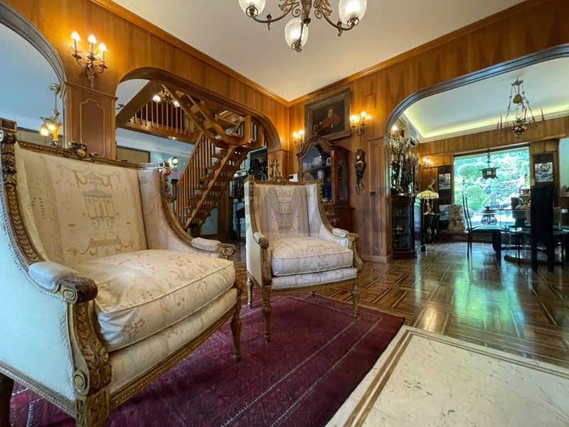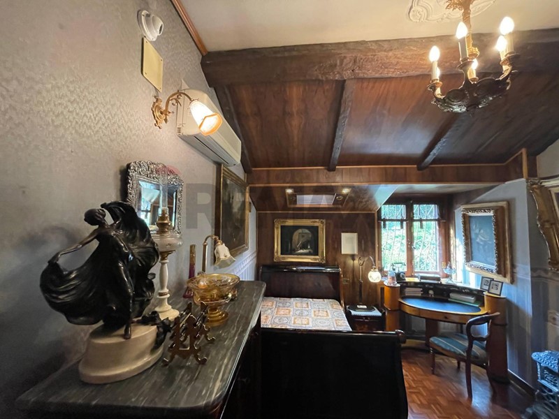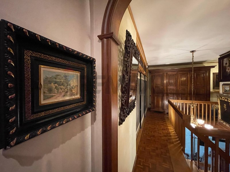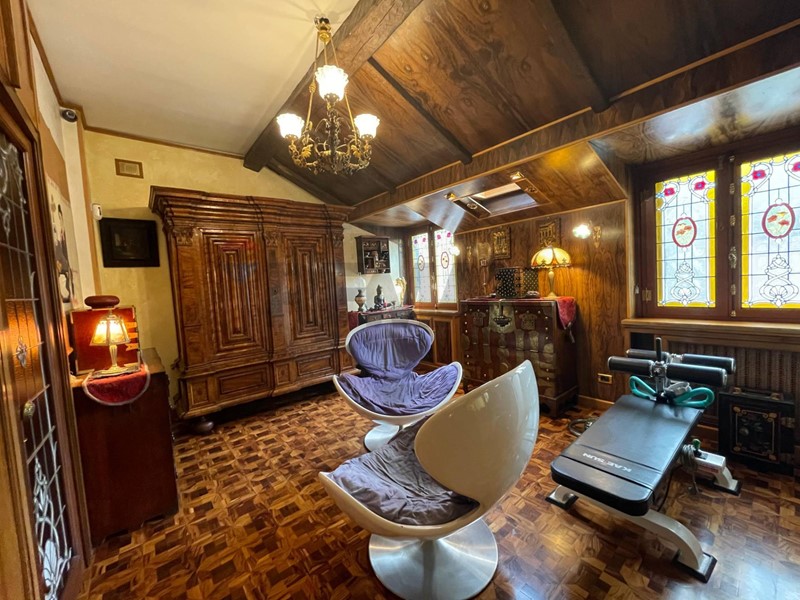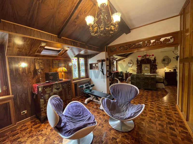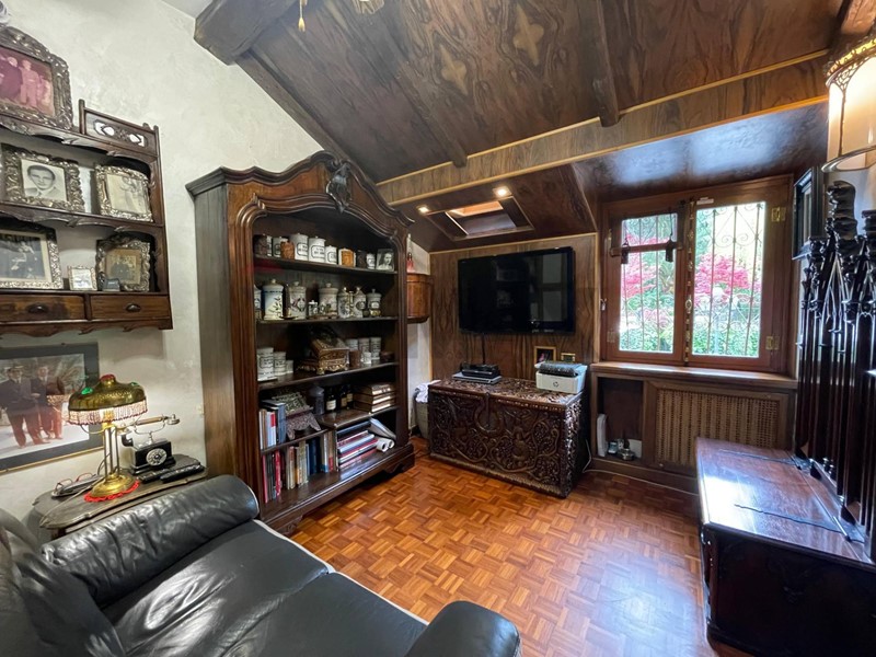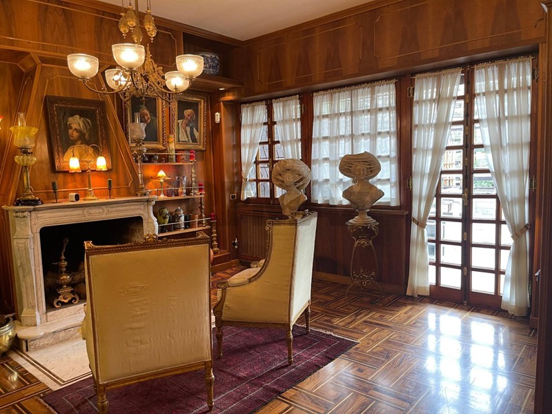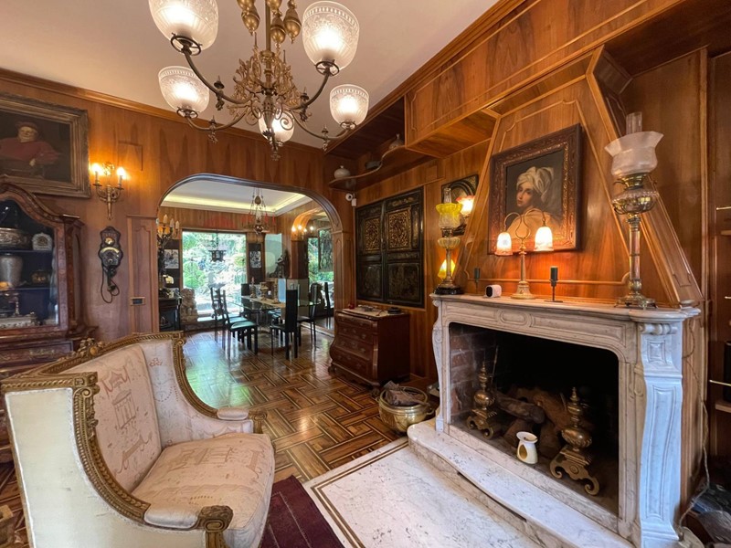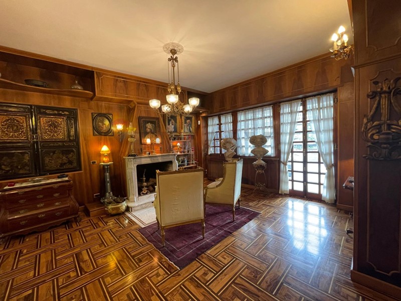 Al primo livello veniamo accolti da un elegante salone doppio completamente rivestito da una boiserie in radica di noce ed un parquet a mosaico di vari legni policromi, con camino francese dellottocento in marmo.