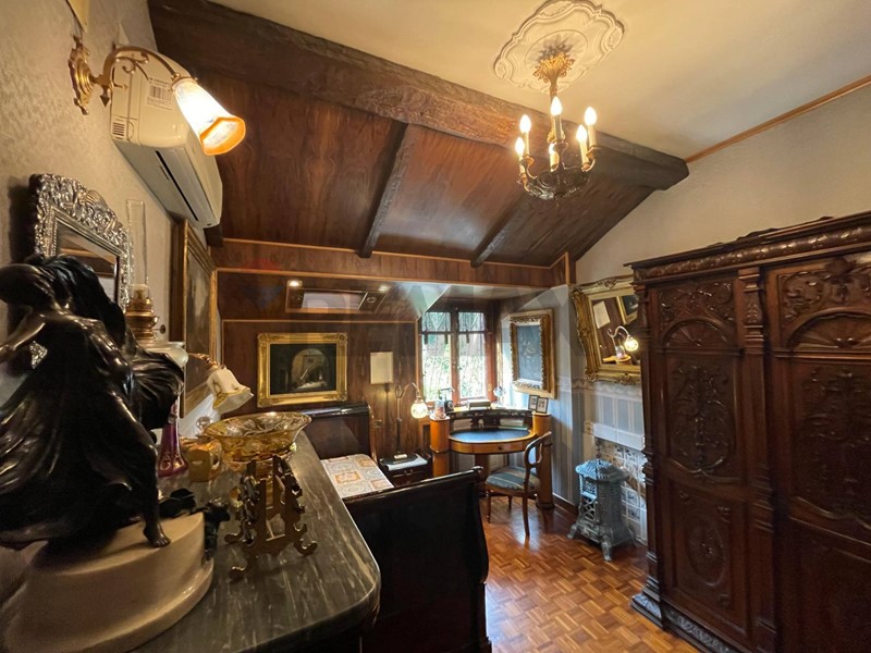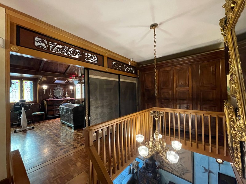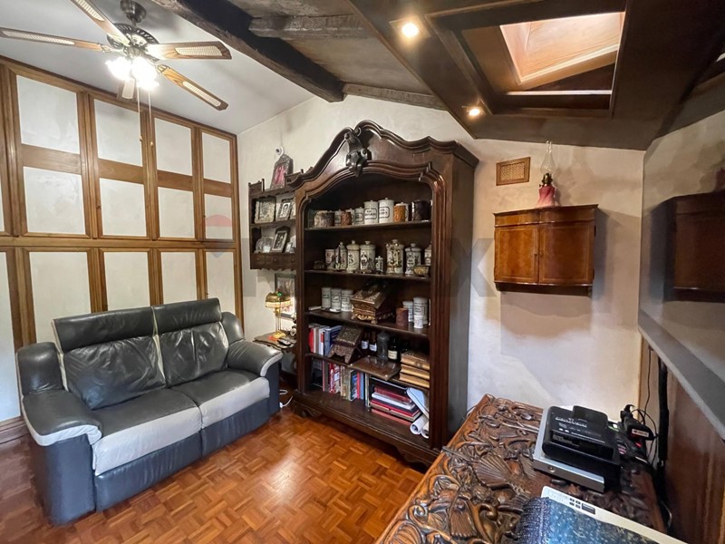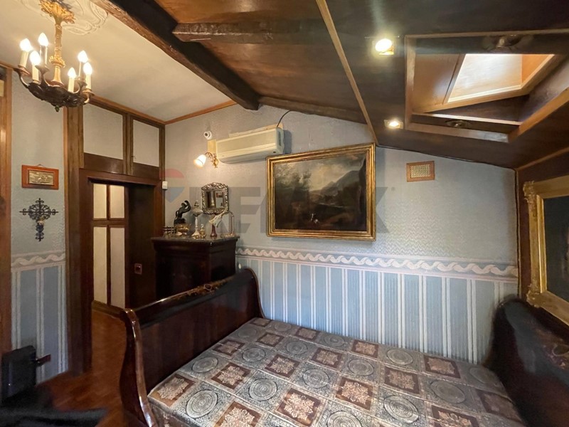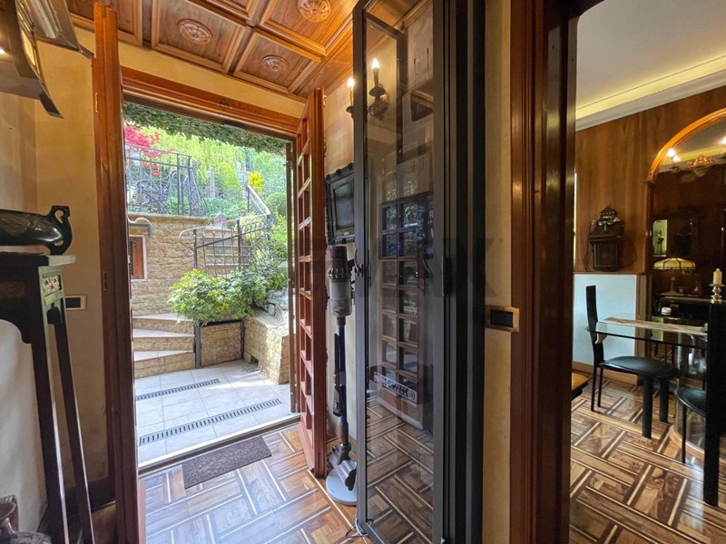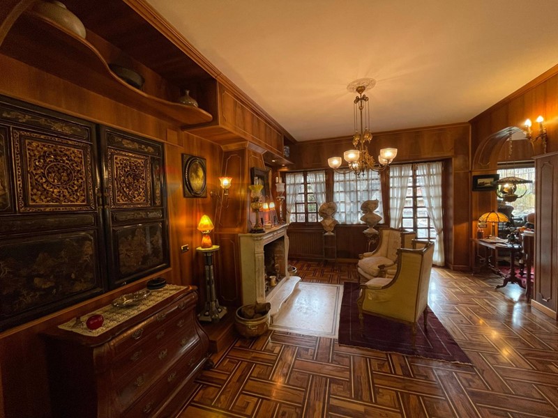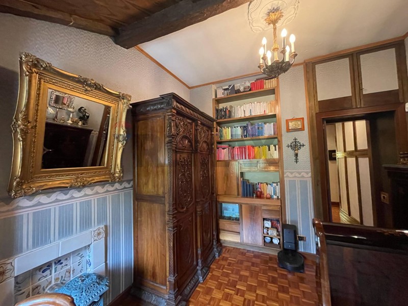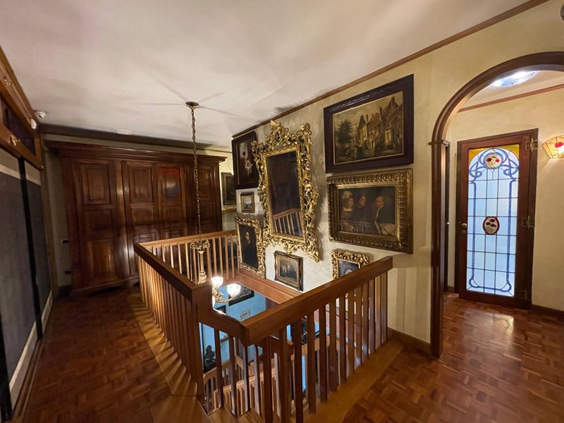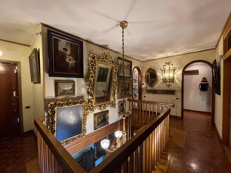 Al primo livello veniamo accolti da un elegante salone doppio completamente rivestito da una boiserie in radica di noce ed un parquet a mosaico di vari legni policromi, con camino francese dellottocento in marmo.