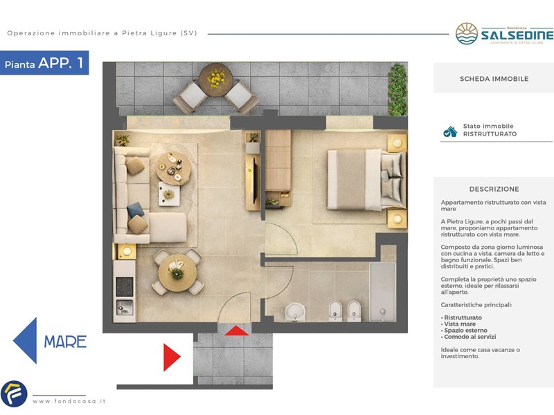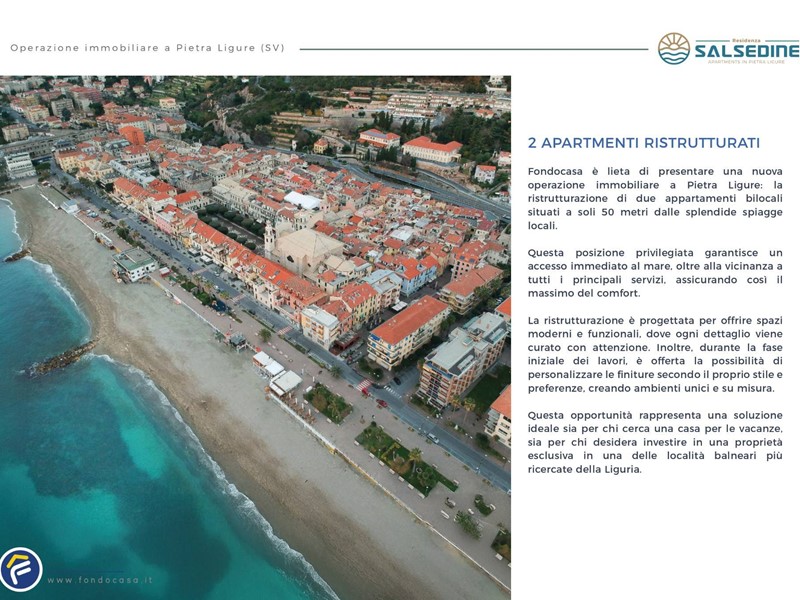 Fondocasa è lieta di presentare un' operazione immobiliare a Pietra Ligure: la ristrutturazione di due appartamenti bilocali situati a soli 50 metri dalle splendide spiagge locali e dal centro storico di Pietra Ligure.