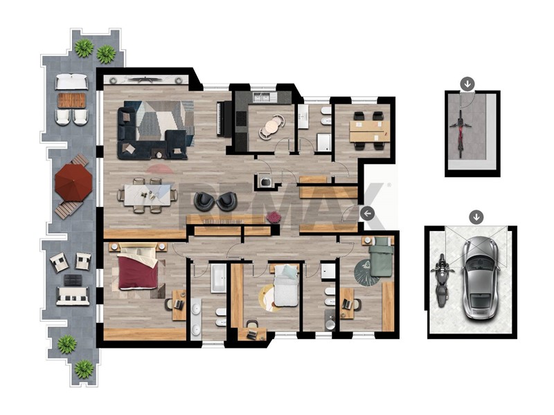 La zona notte comprende tre camere matrimoniali, uno studio e tre bagni, garantendo massima privacy e comfort per ogni membro della famiglia. I disimpegni tra zona giorno e zona notte contribuiscono a una distribuzione armoniosa e pratica degli spazi.