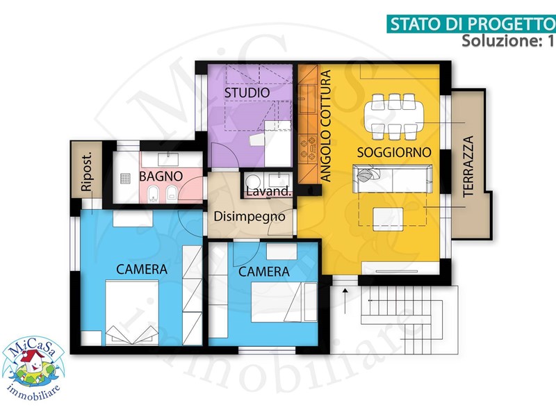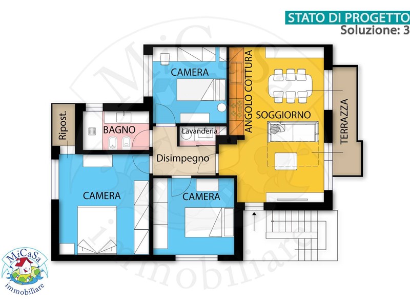 Composto da: ingresso, cucinotto, soggiorno, disimpengo notte, tre camere (di cui una matrimoniale, una doppia e una singola), bagno con box doccia finestrato.