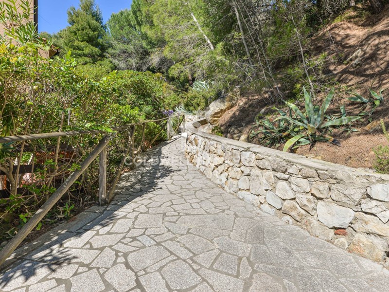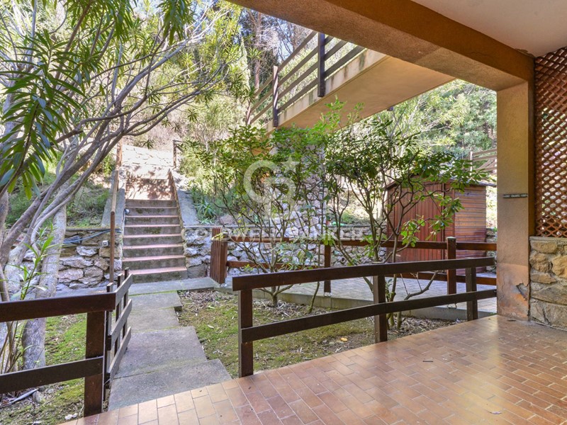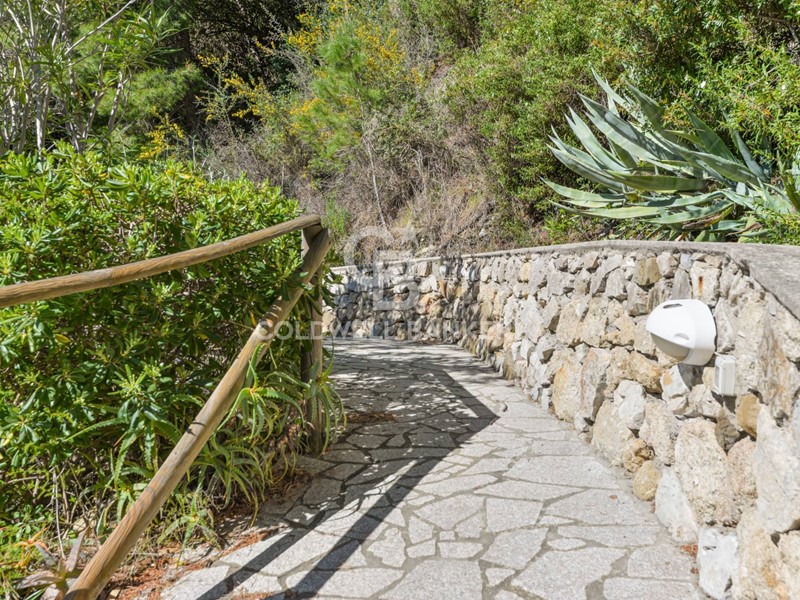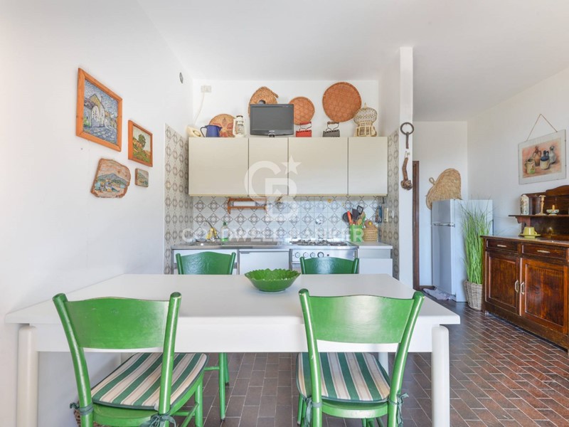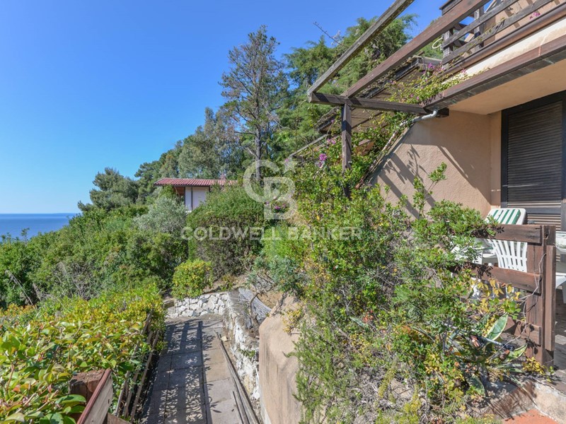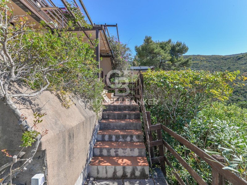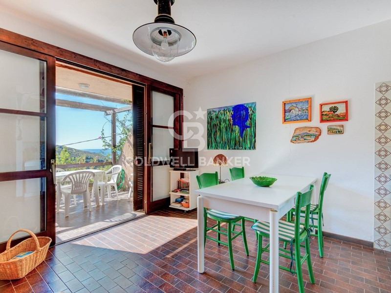 La zona giorno, che comprende una cucina a vista, si apre su una terrazza panoramica con vista mare, da cui parte un sentiero che conduce direttamente alla spiaggia, perfetto per chi ama il mare a portata di mano.