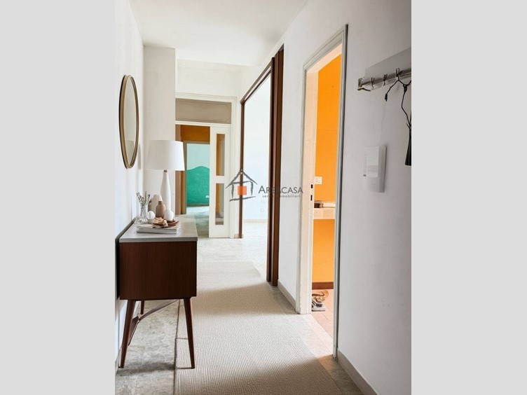 Lingresso introduce a una pianta regolare e ben distribuita, composta da cucina con balcone, soggiorno, tre camere, bagno e un secondo balcone esposto a sud. Lesposizione su tre lati è uno dei punti di forza più importanti: garantisce luce naturale costante e una piacevole sensazione di ampiezza in ogni ambiente.