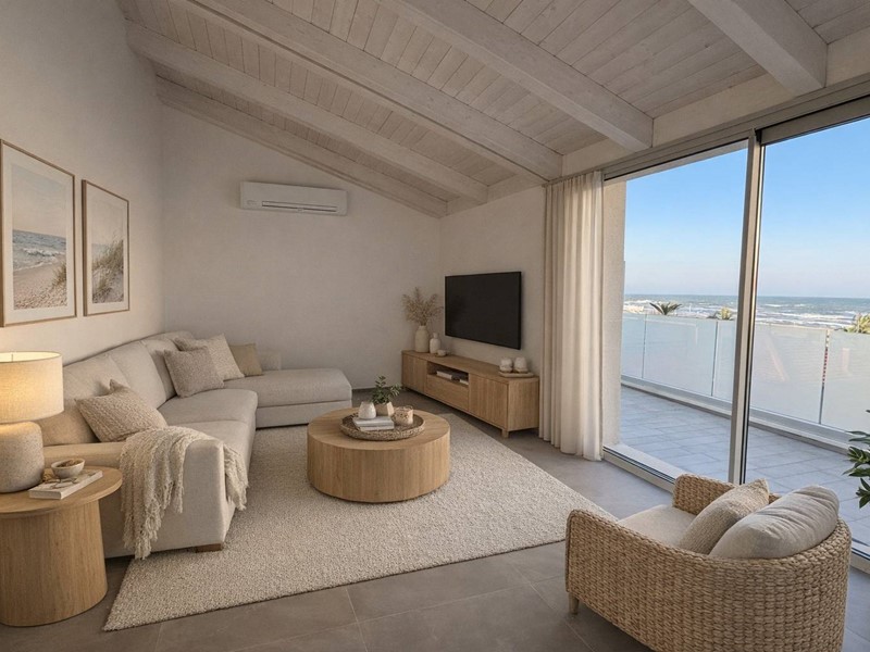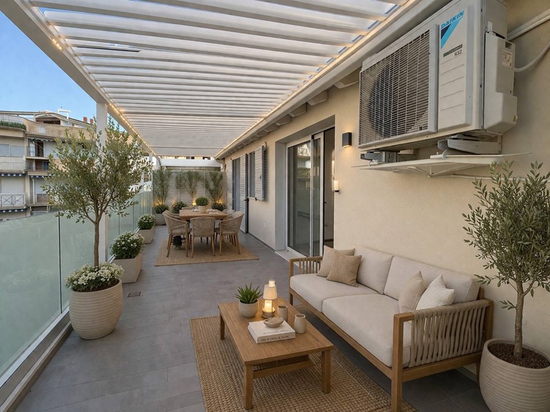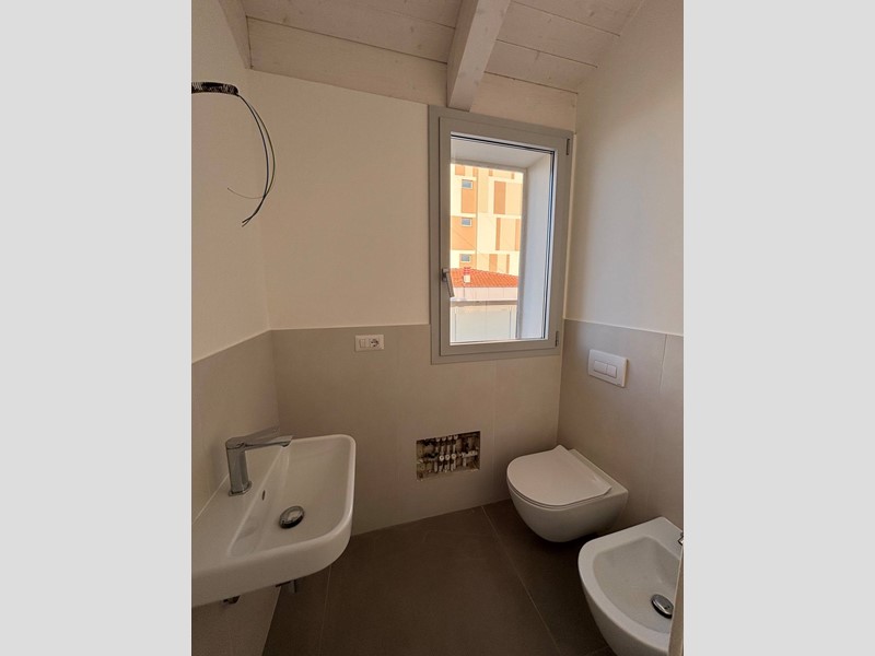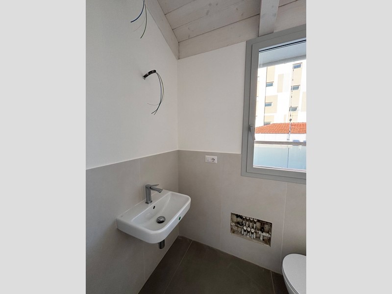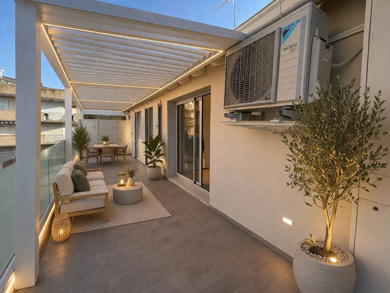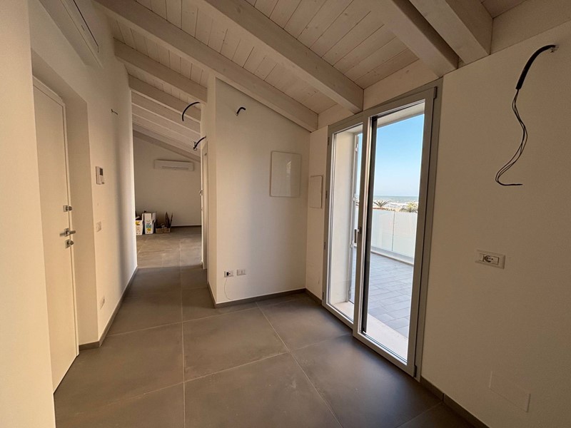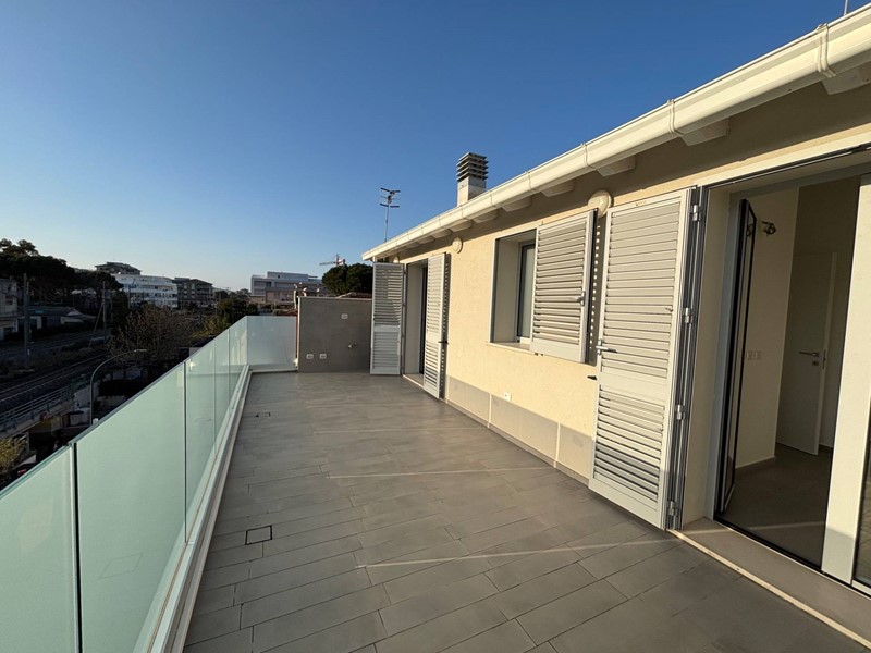 Limmobile, completo di garage, si trova al quarto piano di una palazzina di recente costruzione servita da ascensore. Allingresso si accede alla zona attualmente destinata alla cucina, con la possibilità (come l'ha realizzata il vicino in foto) di ripensare gli spazi spostando la zona cottura sul terrazzo tramite la realizzazione di una pergotenda. Questa soluzione permetterebbe di valorizzare ulteriormente lambiente interno, creando unampia e luminosa zona living dove oggi è presente la cucina. Proseguendo troviamo un bagno di servizio che funge da elemento di separazione tra la zona giorno e la zona living, caratterizzata da grande luminosità grazie alle ampie vetrate in alluminio esposte ad est. Da qui si gode di una splendida vista mare e si accede direttamente al terrazzo principale di circa 30 mq, ideale per momenti di relax allaperto.