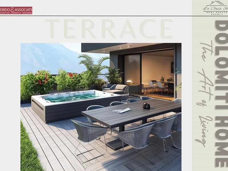 Dalla zona living si accede all'ampia terrazza verde esposta completamente a sud di mq 75, completa la proprietà un giardino di 109 mq, una cantina e un posto auto interno.