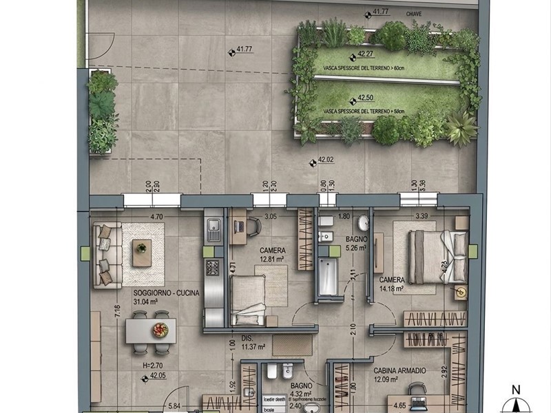 cucina, 2 camere da letto, cabina armadio (terza camera), 2 bagni. Completa la proprietà