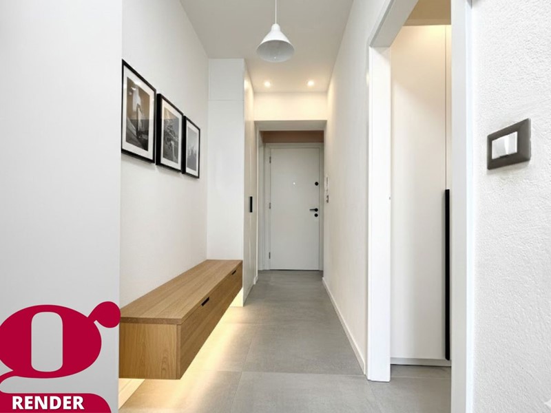 L'appartamento, unico al piano e con tripla esposizione, offre ambienti spaziosi, riservati e molto luminosi. L'ingresso si apre su un comodo disimpegno, che separa con eleganza la zona giorno dal resto della casa. La zona living è ampia e accogliente, con soggiorno e cucina a vista (facilmente separabile), affacciata su un balcone esposto a sud con una gradevole vista aperta sulla catena del Monte Rocchetta.