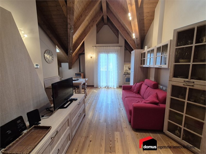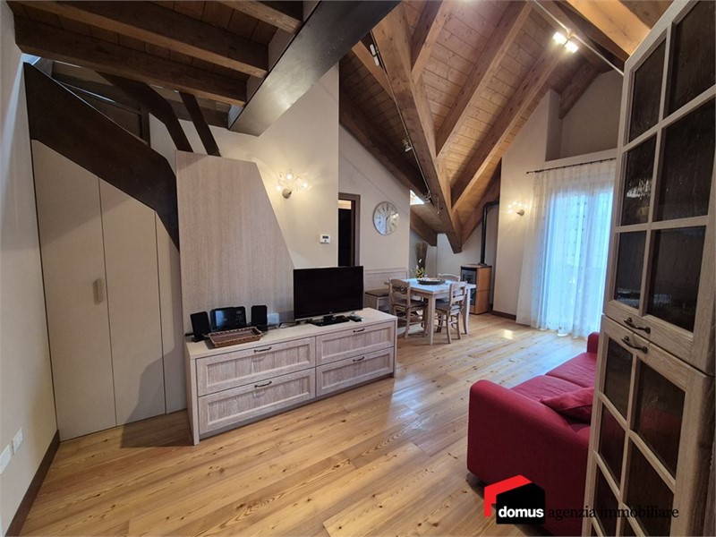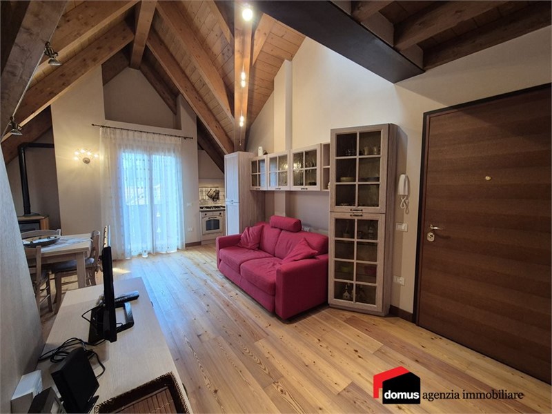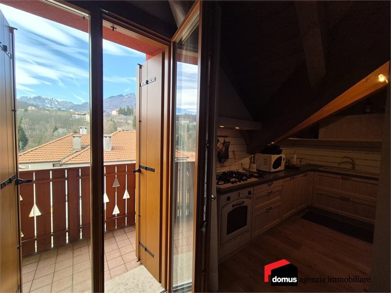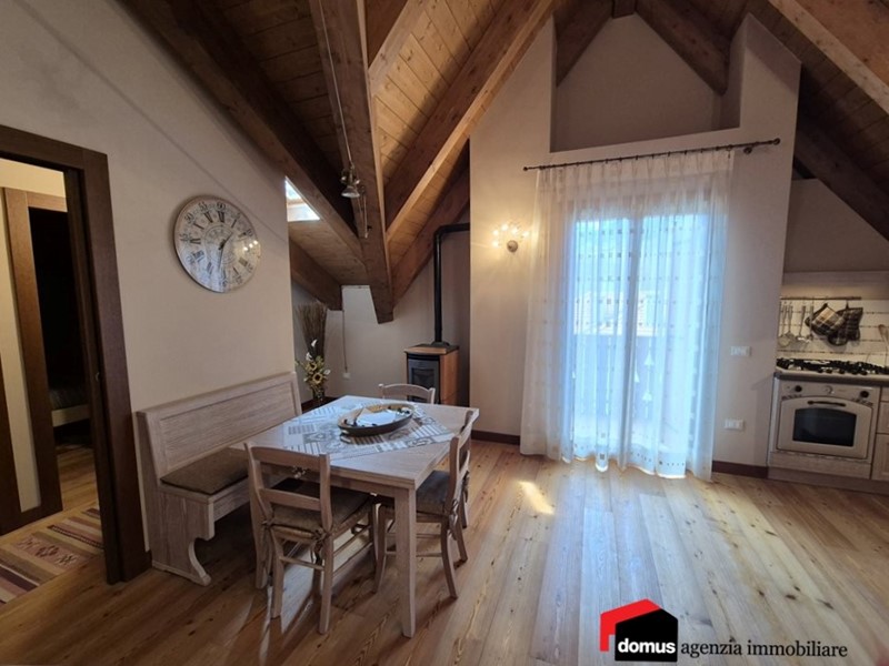 Tonezza centro: elegante e confortevole MANSARDA finemente arredata sita nel cuore di Tonezza del Cimone. Questa splendida unità immobiliare, in privilegiata posizione d'angolo, è situata all'ultimo piano di una tranquilla e recente residenza, presenta pavimenti in legno (rovere), soffitti travati a vista e arredi tipici da montagna conservati pari al nuovo. L'appartamento si compone di ingresso su caratteristica zona giorno suddivisa in angolo salotto-Tv e area dedicata alla cucina-pranzo dotata di stufa a pellet e poggiolo dalla piacevole vista sul Monte Spitz. Nella zona notte trovano collocazione due camere da letto matrimoniali di cui una con poggiolo panoramico (vista sul centro e sull'Altopiano di Asiago), bagno con doccia caratterizzato dai sanitari sospesi e da un raffinato rivestimento in mosaico Bisazza.\nAl piano superiore il sottotetto è stato adibito ad ulteriore camera da letto matrimoniale, ideale per gli ospiti, zona raggiungibile tramite una scala marinara realizzata in legno su misura, come gran parte dell'arredo che rimane al suo interno.\nI locali sono luminosi, ben organizzati e le finiture in legno e materiali naturali regalano quel tipico calore delle case di montagna.\nSoluzione ideale per chi cerca spazio, confort e comodità in pieno centro. Dotata di ascensore, porta blindata, posto auto coperto in garage e comoda cantina, questa casa è perfetta per chi desidera vivere in totale sicurezza, praticità, comfort, e soprattutto per chi desidera abitarla fin da subito.\n\nQuattro buoni motivi per acquistare questo immobile:\n1. posizione d'angolo\n2. finiture di pregio \n3. ottima esposizione\n4. soluzione ideale per essere abitata subito\n - Maggiori Dettagli: Ascensore, Camino, Insonorizzazione, Porta blindata