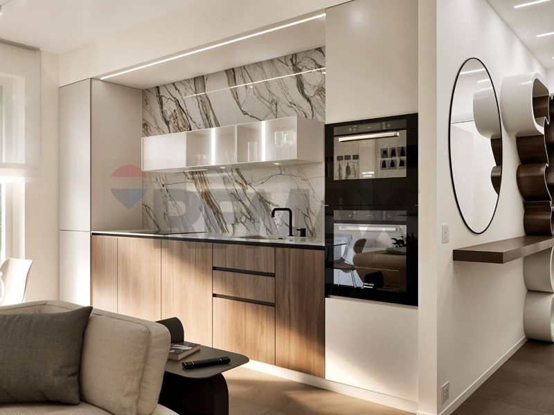 Lingresso si apre su una zona living luminosa con cucina a vista, pensata per ottimizzare gli spazi e creare un ambiente funzionale e accogliente.