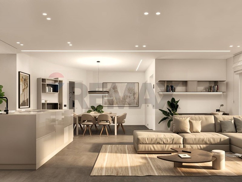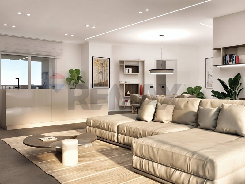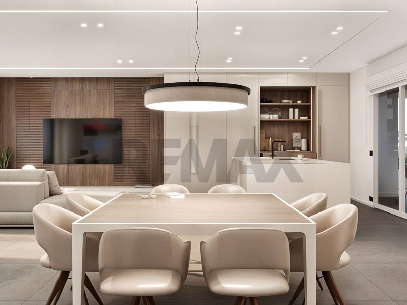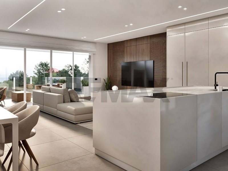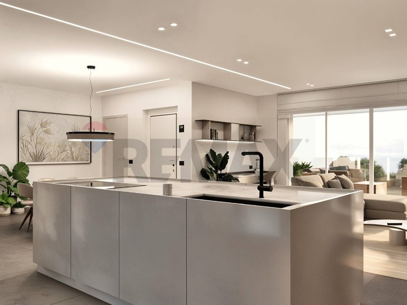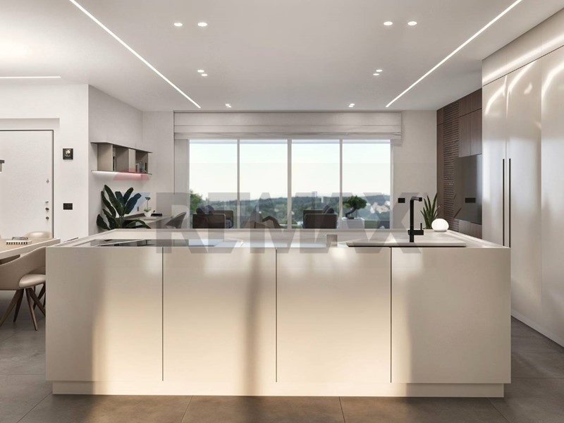 Lampia zona giorno open space con cucina a vista si affaccia su un grande terrazzo che si sviluppa su tre lati, garantendo luminosità e continuità tra interno ed esterno.