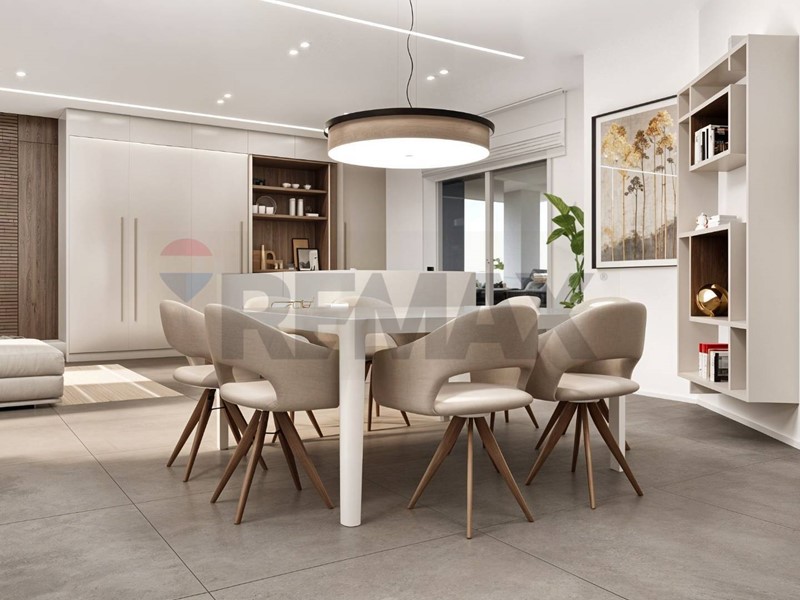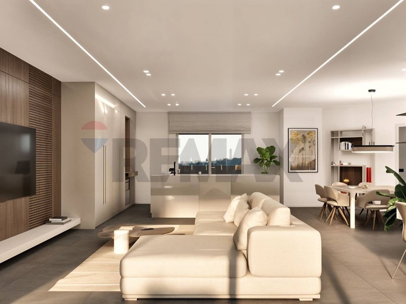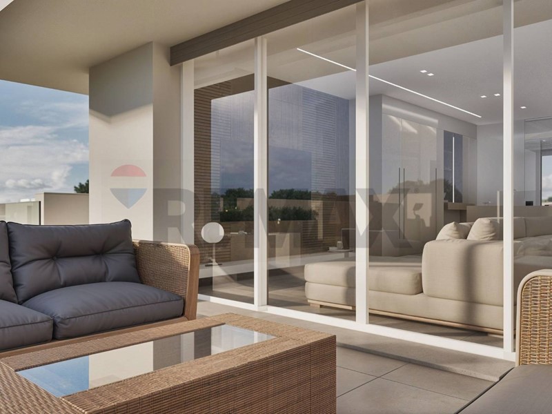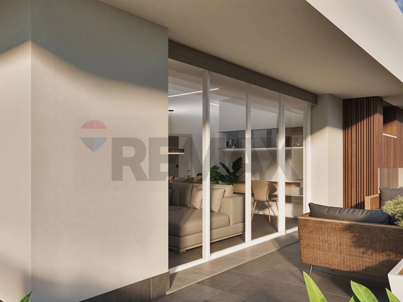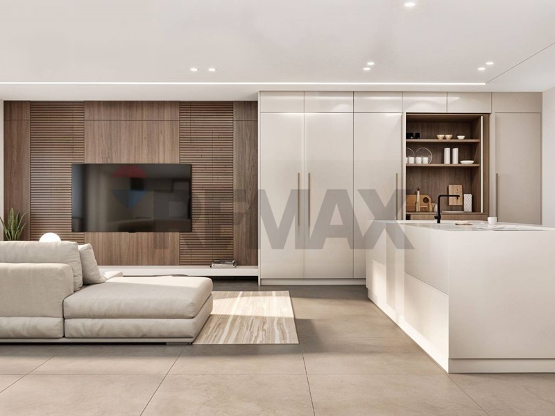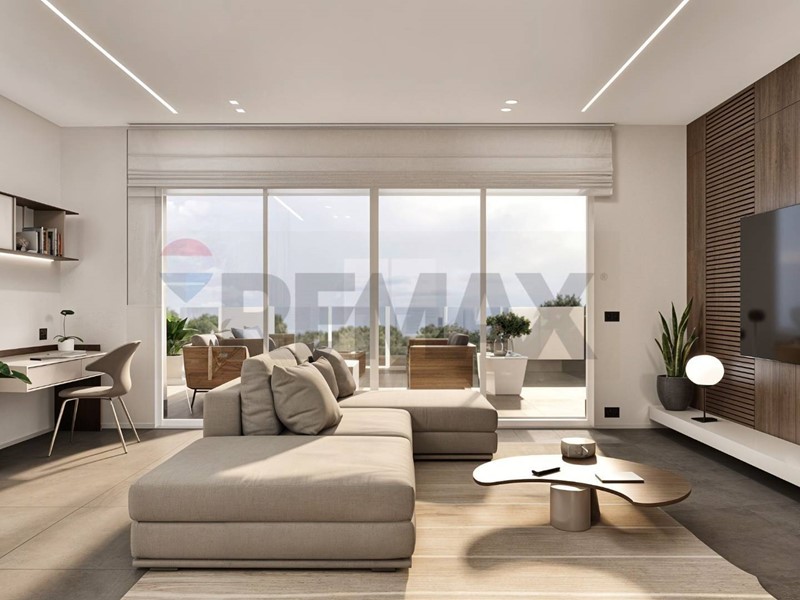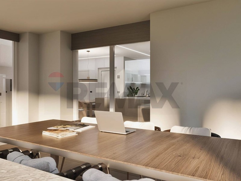 Lampia zona giorno open space con cucina a vista si affaccia su un grande terrazzo che si sviluppa su tre lati, garantendo luminosità e continuità tra interno ed esterno.